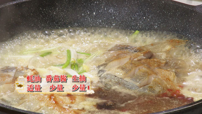 步骤2:锅中倒油,煎制鲳鱼至两面金黄,放入大量生姜,倒入慈菇水烧制;