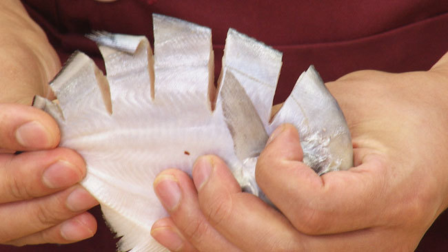 步骤1:鲳鱼不动主骨,如图匀刀切开;