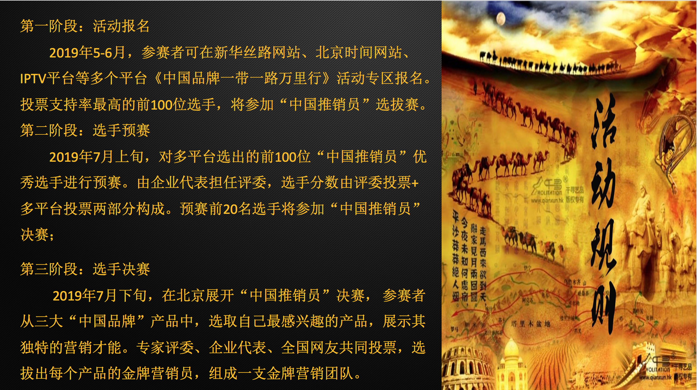 2019年7月,在北京展开“中国推销员”决赛,各参赛者从三大“中共品牌”产品中,选取自己最感兴趣的产品,展示其独特的营销才能。专家评委、企业代表、现场观众、全国网友共同投票,选拔出每个产品的金牌营销员,组成一支金牌营销团队。