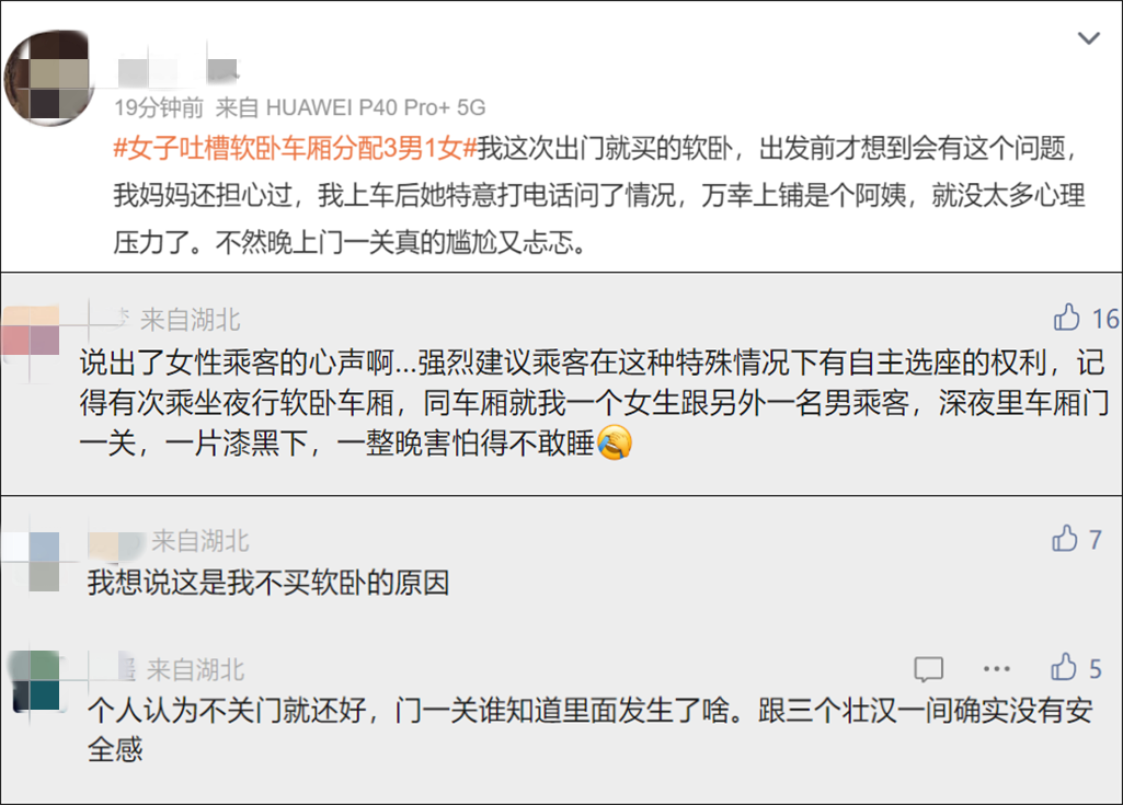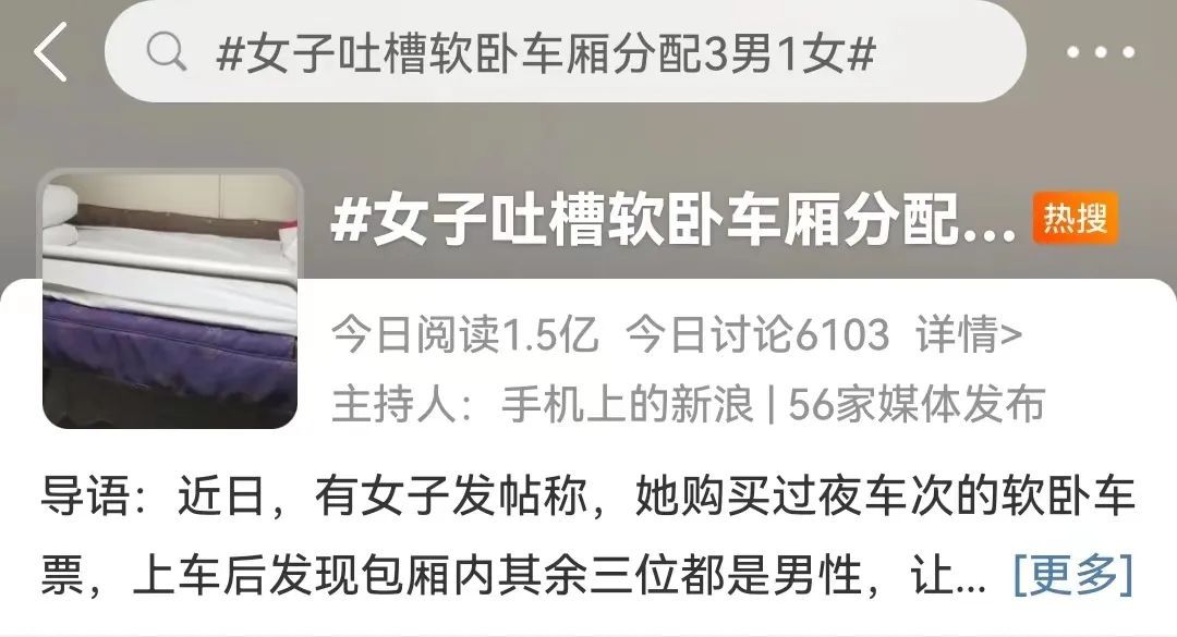 近日“女子吐槽软卧车厢分配3男1女”登上热搜。