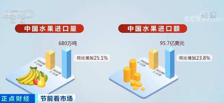 业内人士表示,近两年国内消费者对进口水果需求逐年加大,同时进口关税不断下调,刺激了进口水果量的大幅增加。2019年1-11月,中国水果进口量达到680万吨,同比增加25.1%,进口额95.7亿美元,同比增加23.8%。