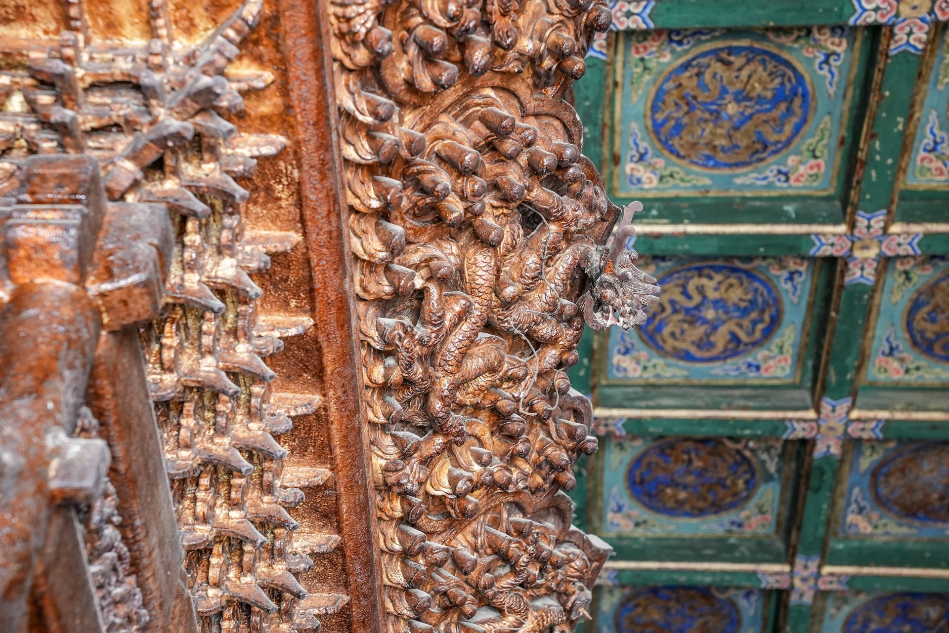 在修缮过程中,不断有新发现。在对正殿抱厦排水立柱的“解剖”中,工作人员发现柱子内部的金属管为锡铅合金材质,这种合金兼具防水防潮、耐大气侵蚀的特性,适配排水需求;东暖阁北墙用于采光的透明雨棚,经细致辨认与分析,确认其为上千枚来自大海的海月贝壳打磨而成的“明瓦”,这种材质既透光又具韧性,在阳光下光彩夺目。