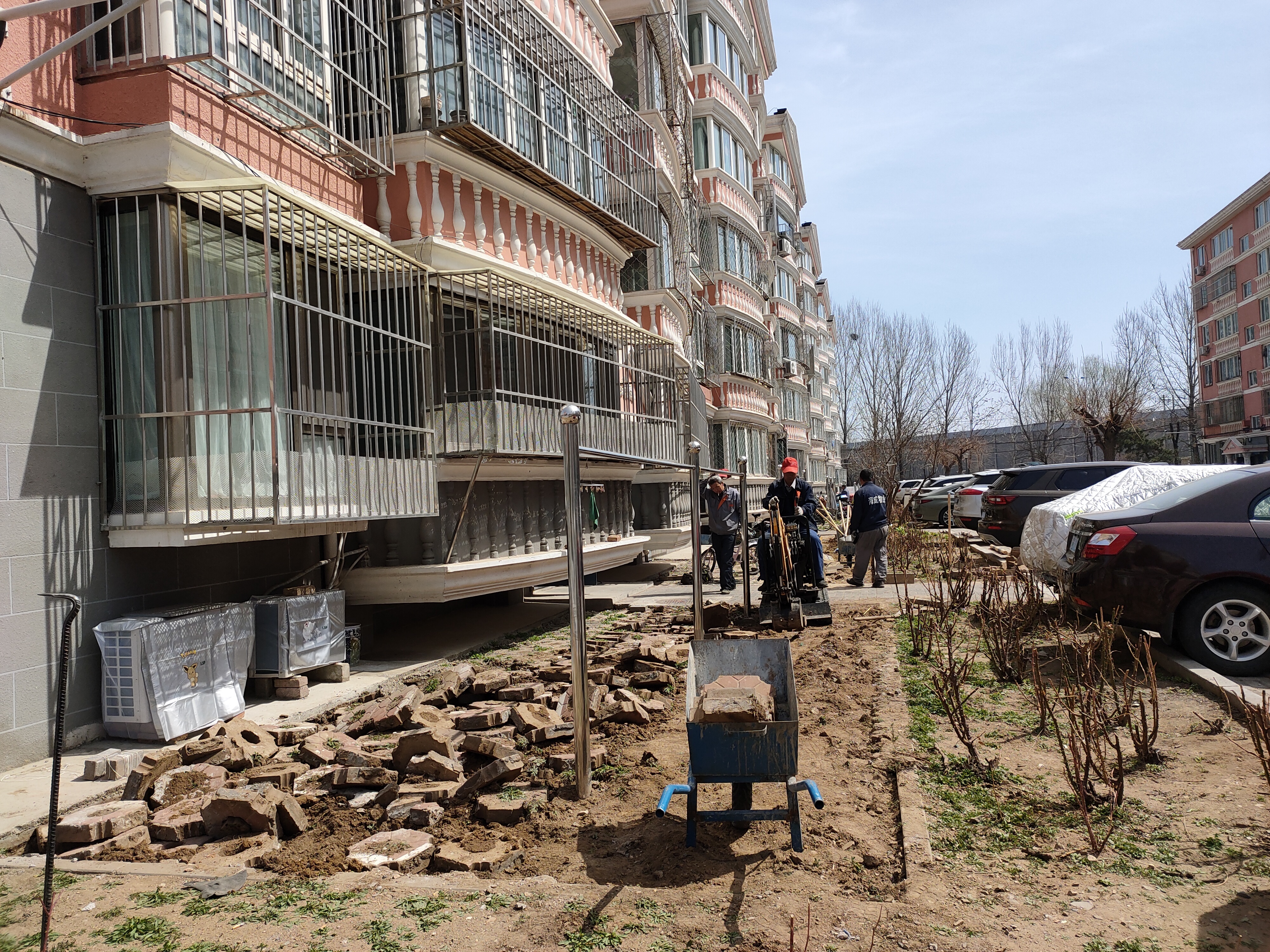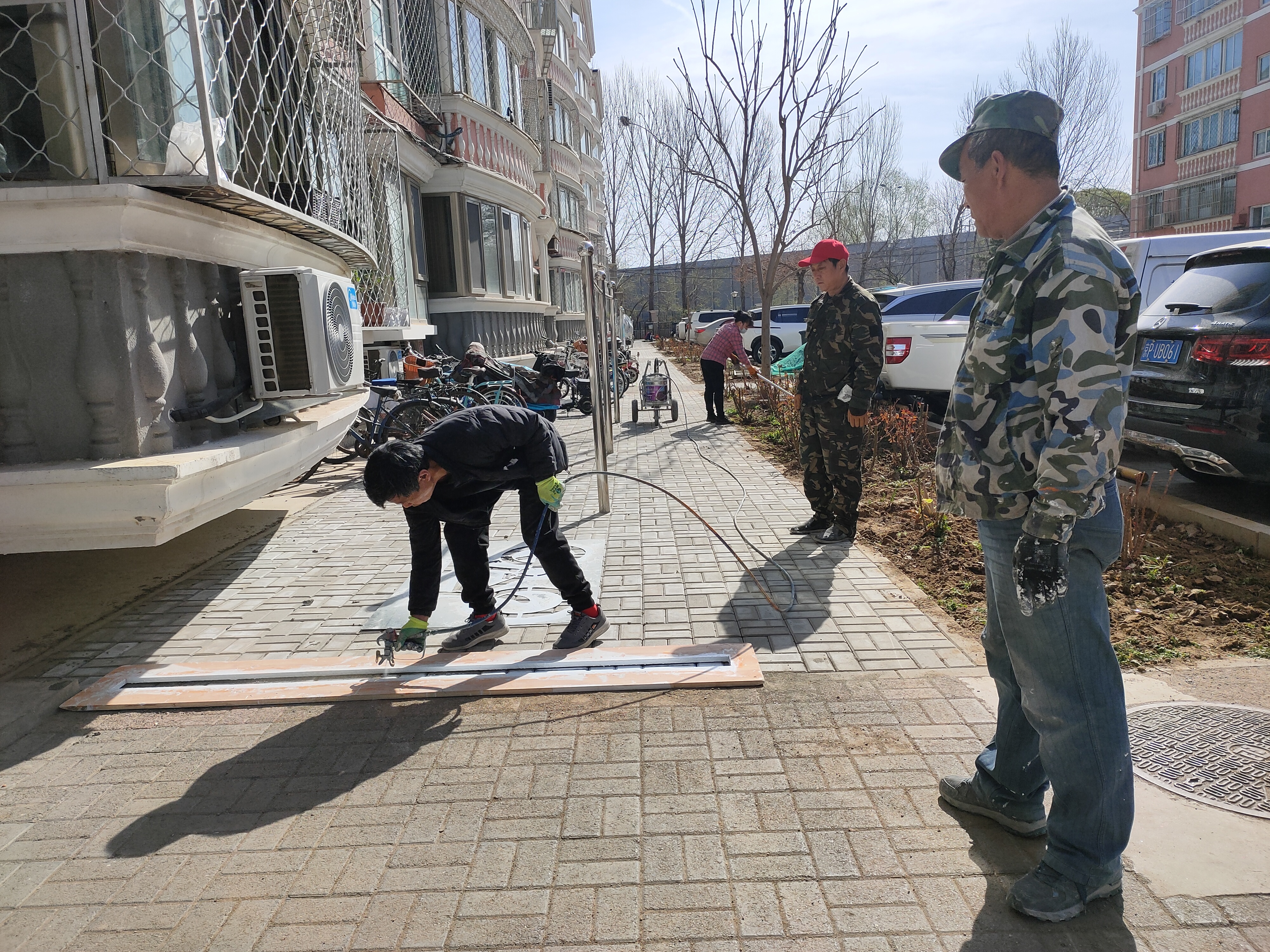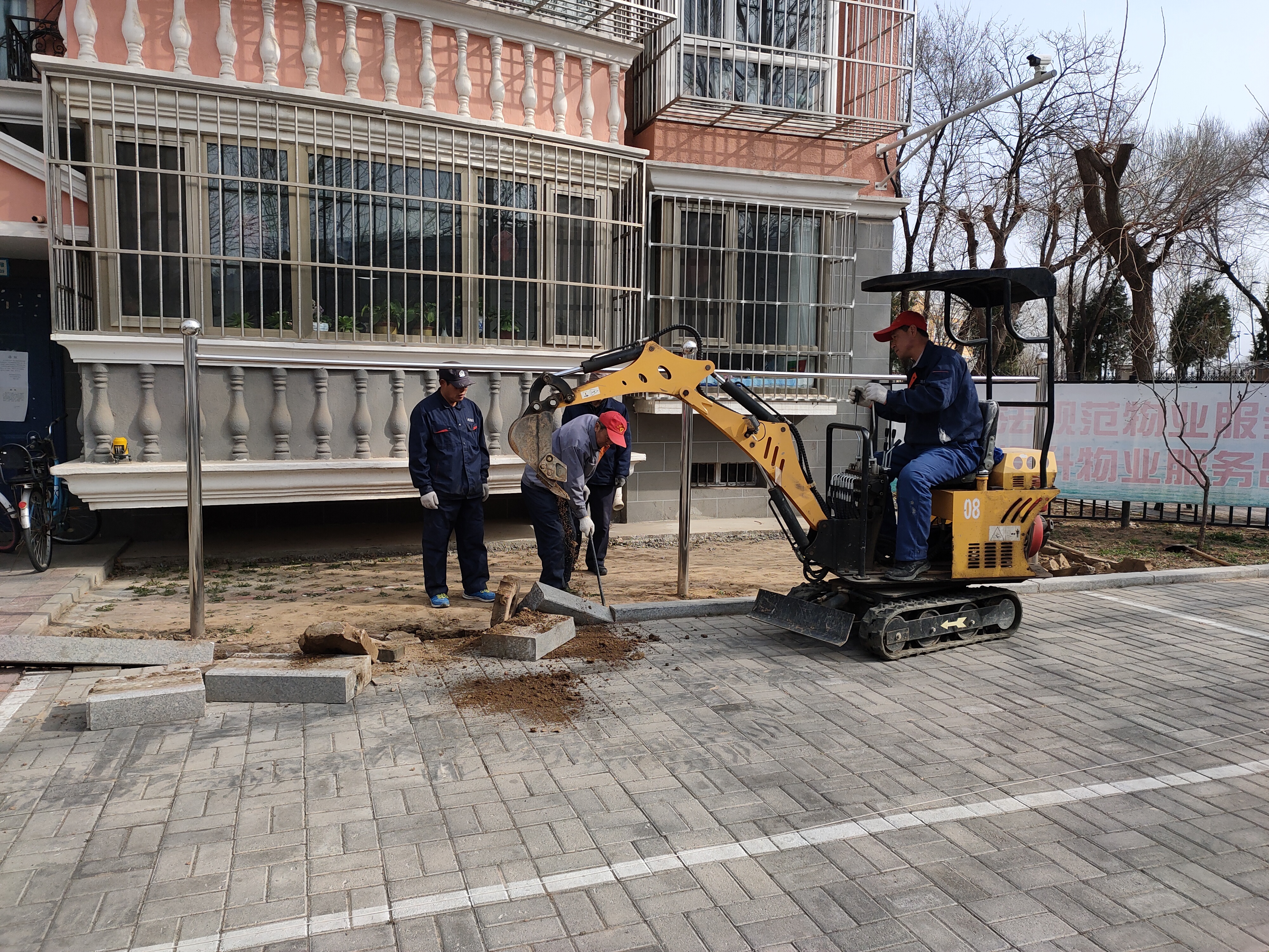 4月10日上午,施工队到达现场进行施工,将原有的草坪砖及破损路面全部挖开,重新做防水,铺设透水砖,完成后在新路面上施画非机动车停车位。历时近10天,施工人员将8号楼和10号楼前的草坪砖全部更换完毕,更换路面500多平方米。