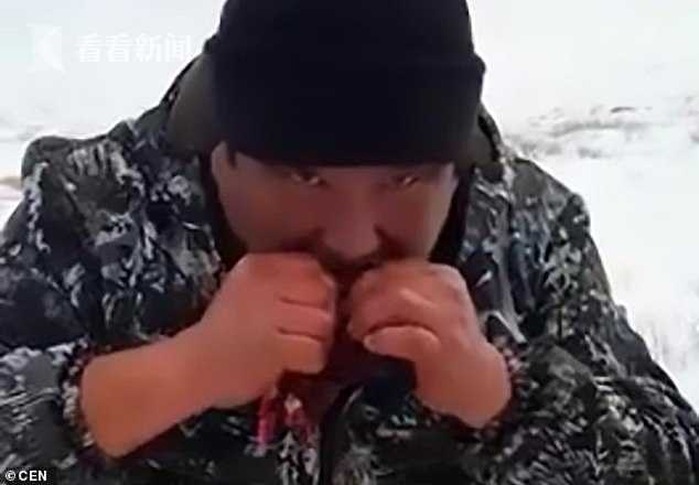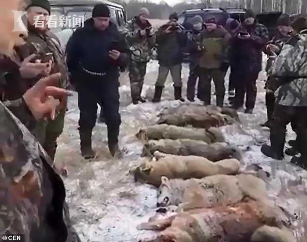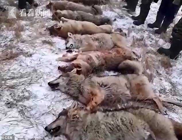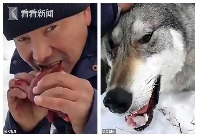 村民们将杀死的10条狼放在空旷的地上展出,有两名猎手还对着镜头展示生吃狼的肝脏。这些肝脏是刚从狼的身上掏出来的,还冒着热气儿。