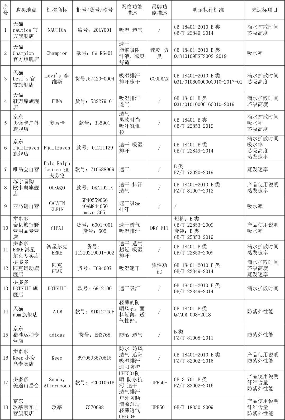 具体如下:其中,购于拼多多(泰亿旅行野营用品专营店)宣称为“迪卡侬儿童紧身衣运动健身服弹力训练服速干跑步打底套装”的儿童运动衣样品,实际收到的样品标称为“YIPAI”牌,且宣传的吸湿速干性能均未达到相关标准要求。