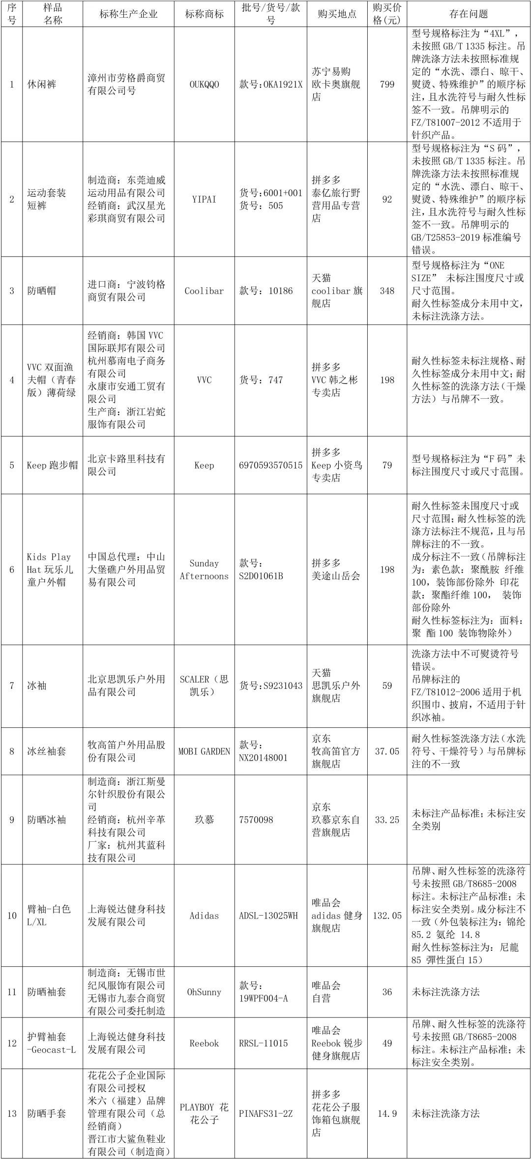 经测试,80件样品中有27件存在未达到相关标准要求的现象,其中13件为速干服装样品,14件为防晒类样品。