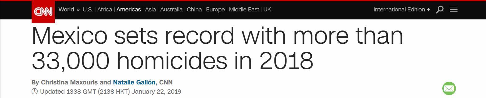 美国有线电视新闻网(CNN)22日报道称,墨西哥2018年发生的有记录在案的凶杀案达到了超过3.3万起,是统计以来最高记录。