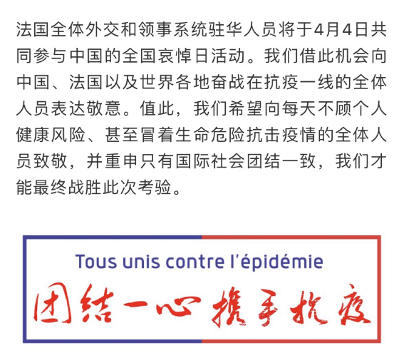 此外,法国驻华大使馆通过官方微信公众号表示:“我们借此机会向中国、法国以及世界各地奋战在抗疫一线的全体人员表达敬意。值此,我们希望向每天不顾个人健康风险、甚至冒着生命危险抗击疫情的全体人员致敬,并重申,只有国际社会团结一致,我们才能最终战胜此次考验。”