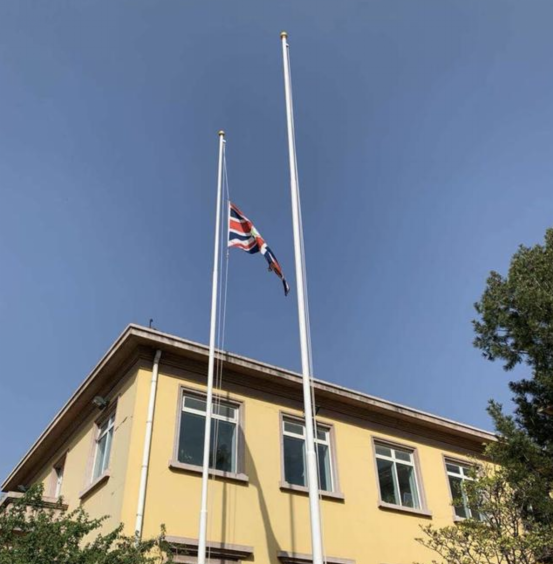 (英国驻华大使馆降半旗)