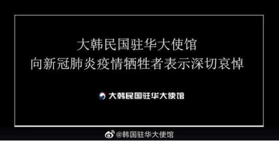 韩国驻华大使馆在官方微博发文表示:“大韩民国驻华大使馆向新冠肺炎疫情牺牲者表示深切哀悼。”