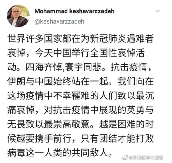 伊朗驻华大使穆罕默德·克沙瓦尔兹扎德在社交媒体上用中文发文。他写道:“世界许多国家都在为新冠肺炎遇难者哀悼,今天中国举行全国性哀悼活动。四海齐悼,寰宇同悲。抗击疫情,伊朗与中国始终站在一起。”