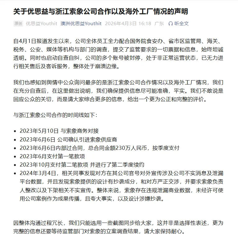 ▲优思益发布声明,“整体处于崩溃边缘”。图 / 优思益官方