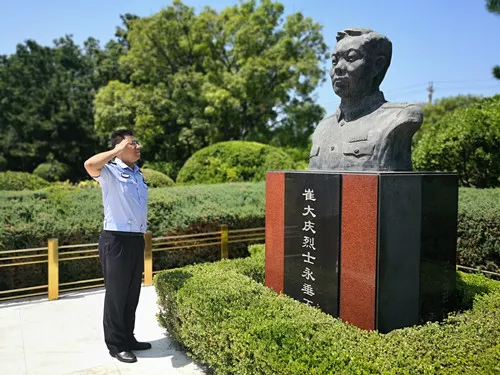 崔申迪向父亲崔大庆铜像敬礼。唐娜/摄影