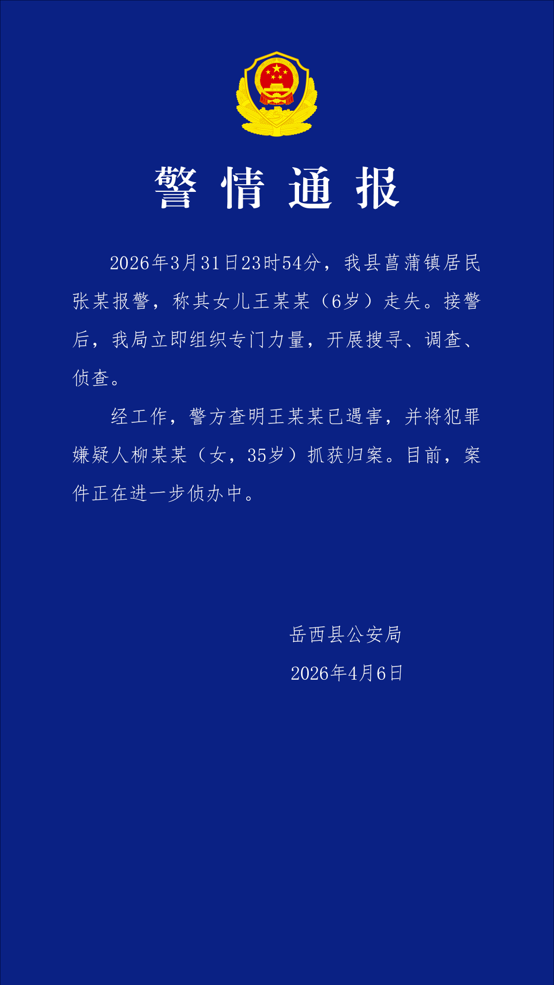 近日,安徽省安庆市岳西县菖蒲镇一6岁女童失联。6日晚,当地发布通报称,该女童已遇害,犯罪嫌疑人柳某某(女,35岁)已被警方抓获归案。