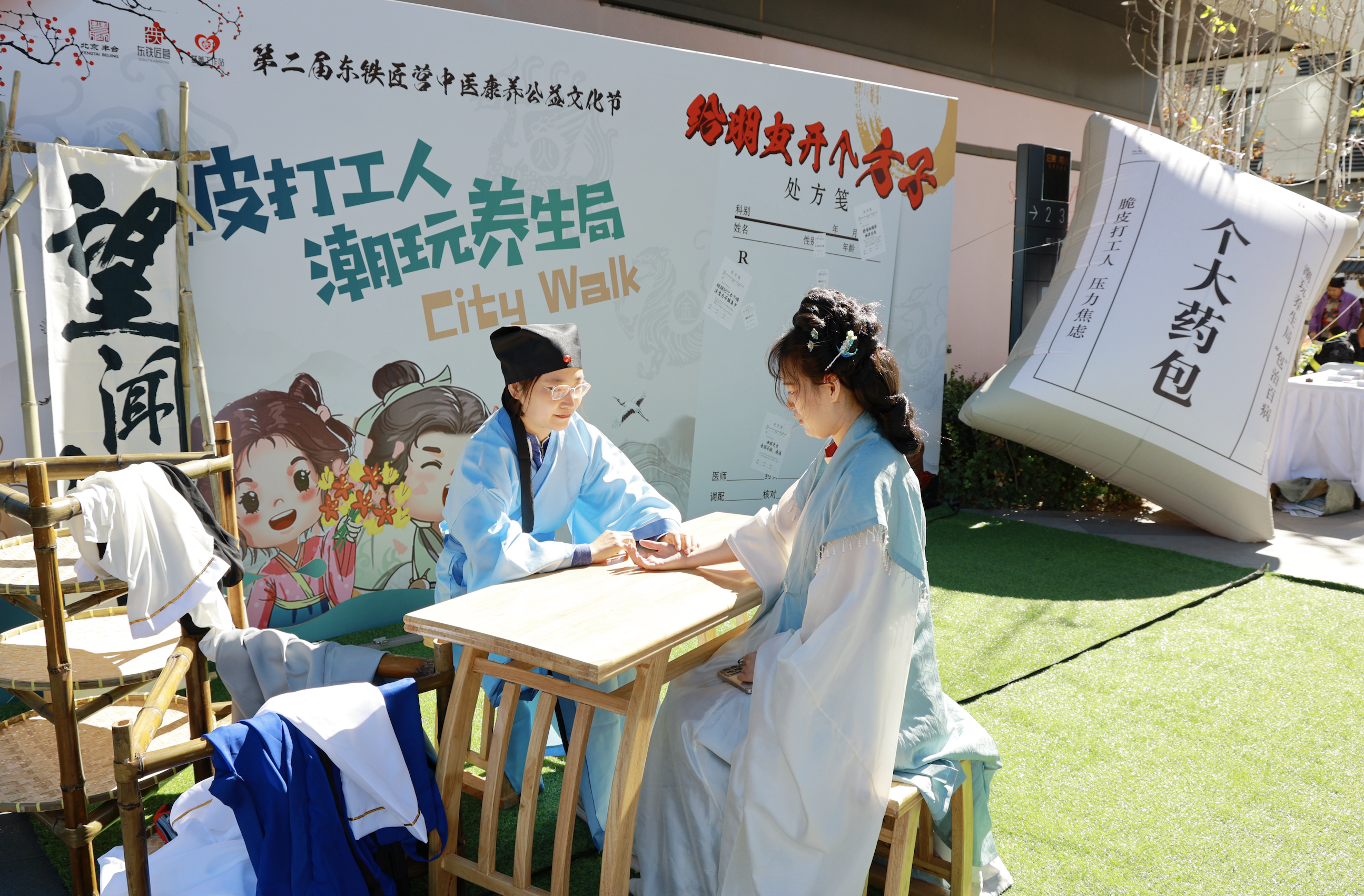 记者在签到打卡区看到,身着汉服的中医药爱好者正在巨型“中药包”旁合影留念。在这里,居民们可以免费换装,在“脆皮打工人,潮玩养生局”主题墙前领取趣味“处方笺”,上面针对现代城市居民的不同“症状”,给出了“佛系青年适当卷,撸起袖子加油干”“重度恋爱脑要学会爱自己”等“对症”建议,以诙谐幽默的语言提醒参与者关注健康、重视养生。