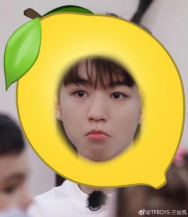 照片中,王俊凯对镜嘟嘴,头部被PS上了一个偌大的柠檬,化身"柠檬男孩",可爱十足。