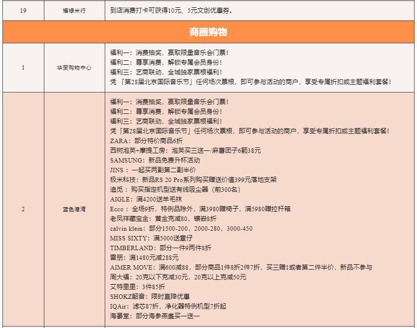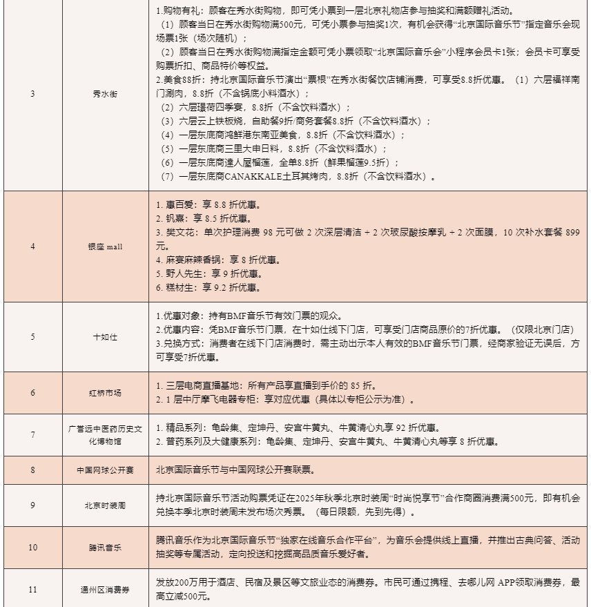 北京国际音乐节联动蓝色港湾、华贸购物中心、秀水街等优质商圈,推出音乐节票根专项优惠及购物有礼活动。消费者可凭音乐节票根在合作商圈享受优惠折扣,在指定商户消费满额即可赠送对应等级北京国际音乐节会员,还有机会免费获得音乐节门票及文创周边。此外,本届音乐节还将在重点商圈开展快闪音乐会等活动,实现音乐艺术与商业消费的深度融合。