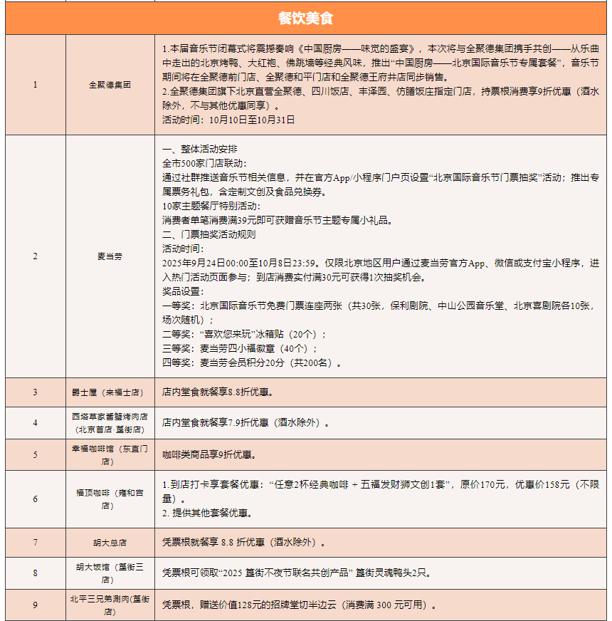 本届音乐节闭幕式将奏响《中国厨房——味觉的盛宴》,与全聚德集团携手共创——从乐曲中走出的北京烤鸭、大红袍、佛跳墙等经典风味,推出“中国厨房——北京国际音乐节专属套餐”,音乐节期间将在全聚德前门店、全聚德和平门店和全聚德王府井店同步销售。