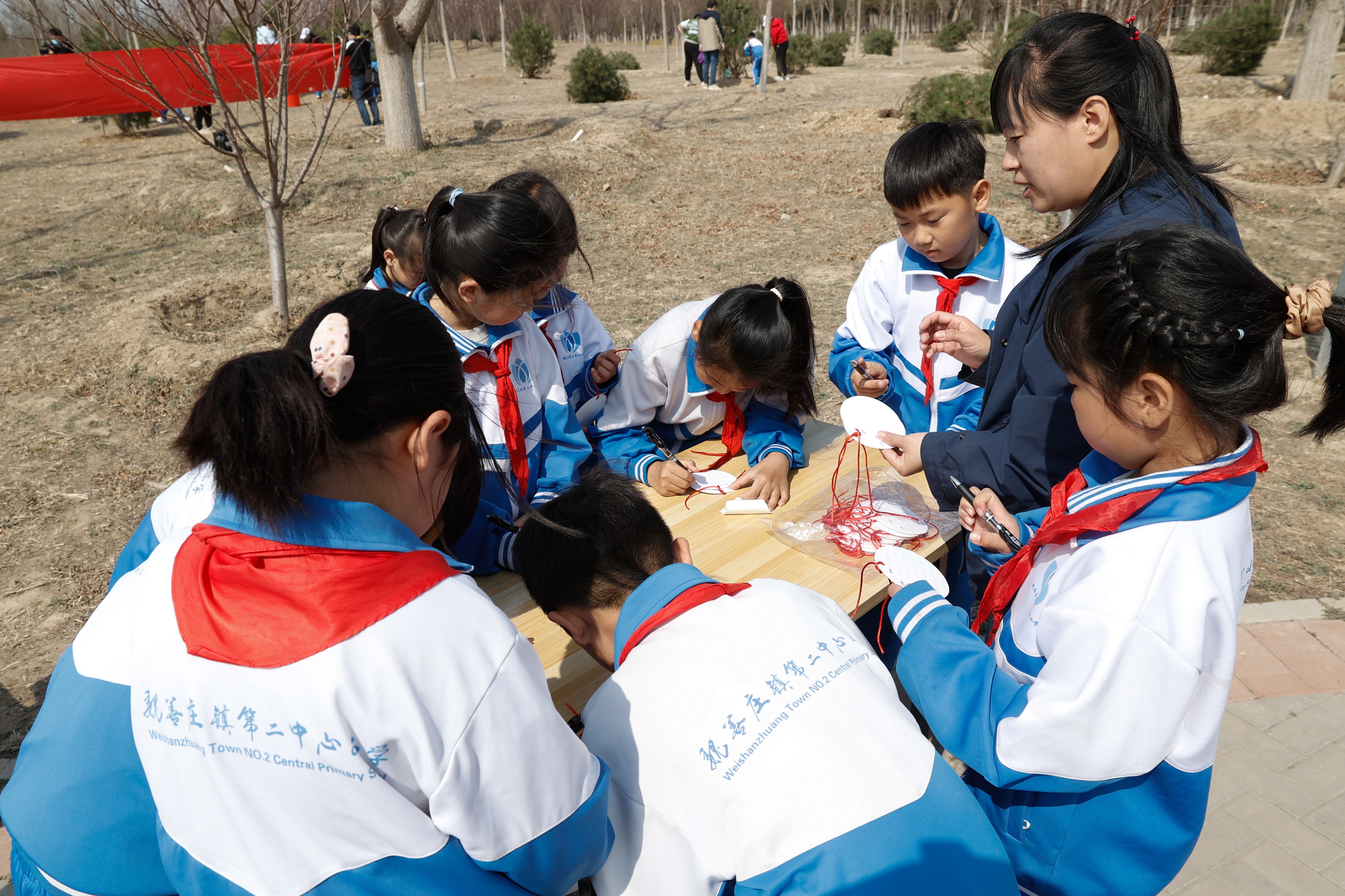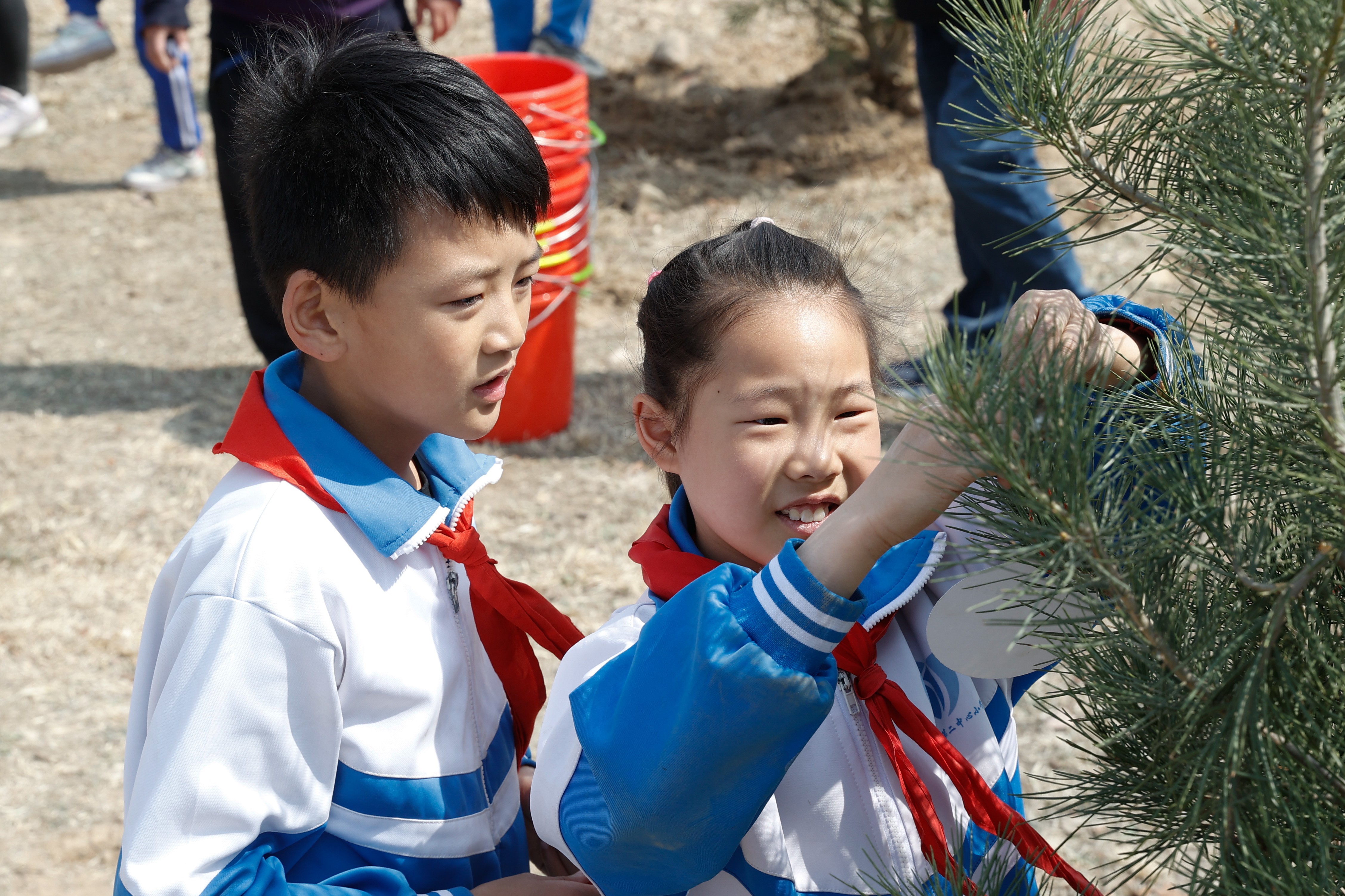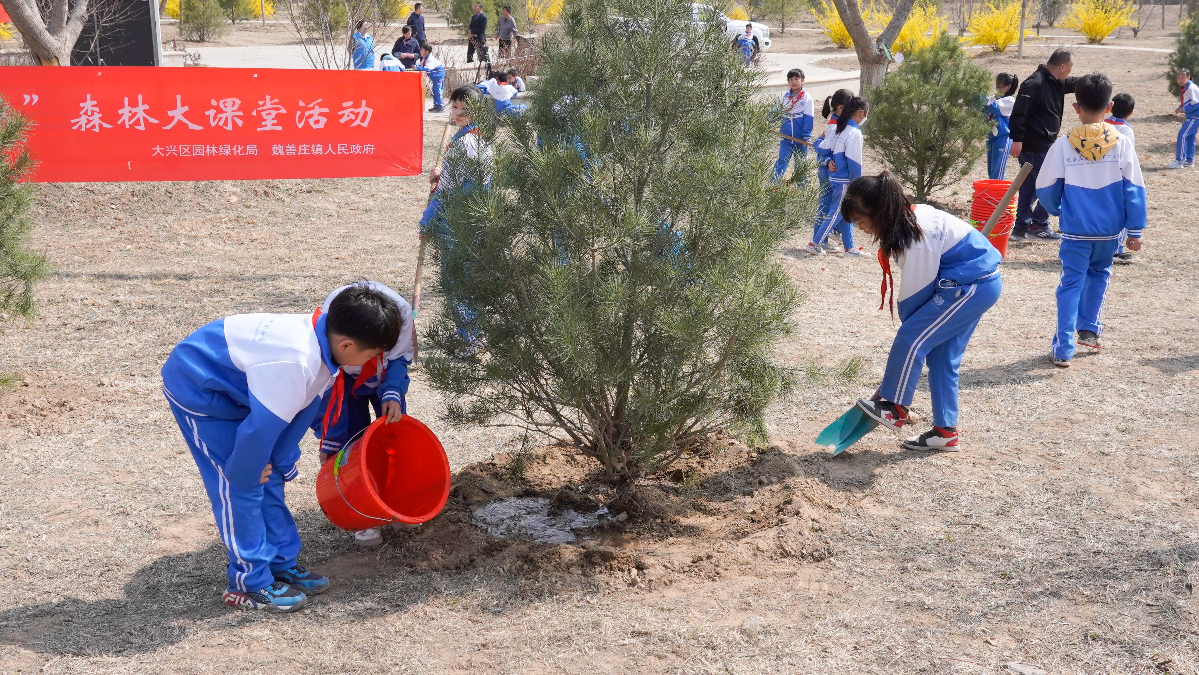 图注:小学生植树、浇水