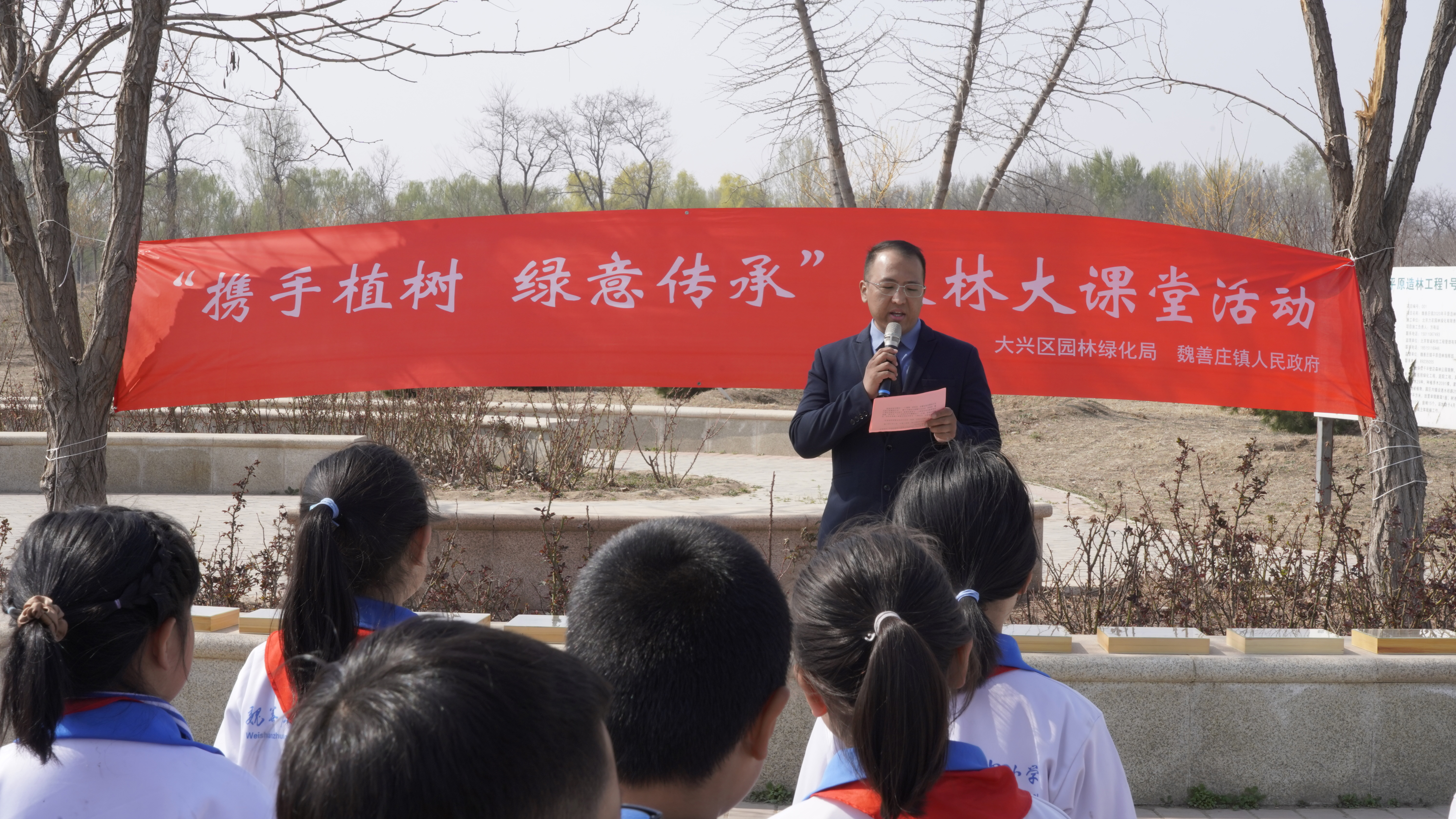 春回大地万物复苏,植树添绿正当时,3月31日上午,在大兴区魏善庄镇半壁店森林公园里,以大自然为课堂,植树为主题,植绿为作业。大兴区绿化委员会办公室、魏善庄镇人民政府与魏二小师生携手开展“携手植树,绿意传承”森林大课堂,开启了一场“与大自然的对话”。“五老”志愿者、青年志愿者参与。
