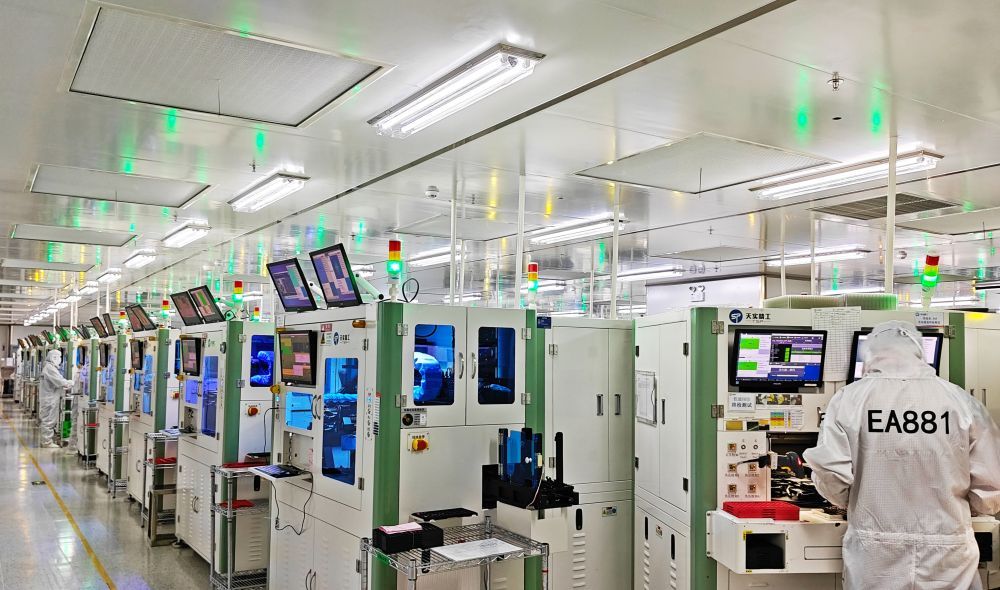 4月3日在重庆市天实精工科技有限公司无尘车间拍摄的摄像头模组自动化生产作业现场。