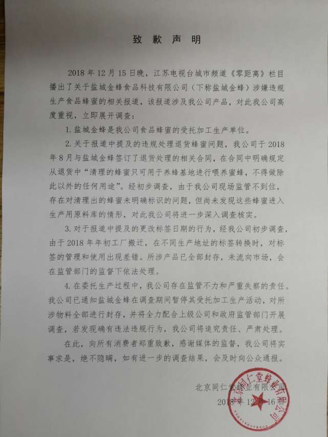 12月15日晚,江苏电视台城市频道《零距离》栏目播出了关于盐城金蜂食品科技有限公司(下称盐城金蜂)涉嫌违规生产食品蜂蜜的相关报道,为此,北京同仁堂发表相关声明表示,相关产品已全部封存,未流向市场!