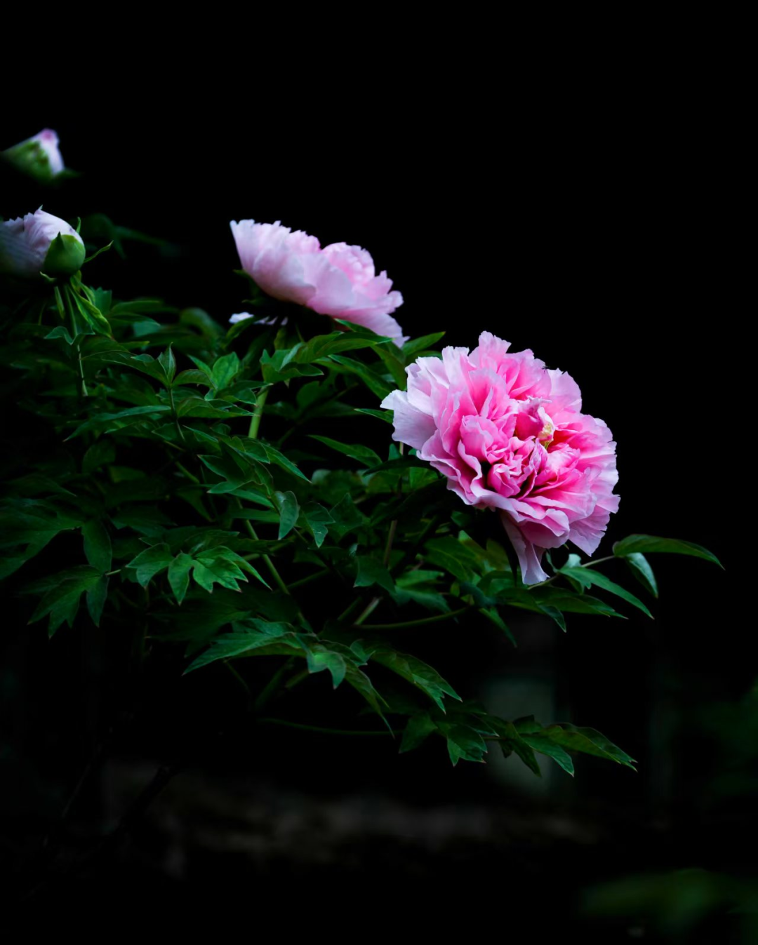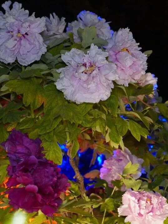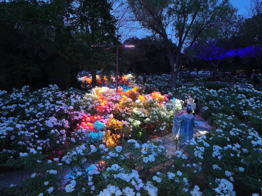 游客可于暮色中细赏牡丹与古建相融的静谧画面