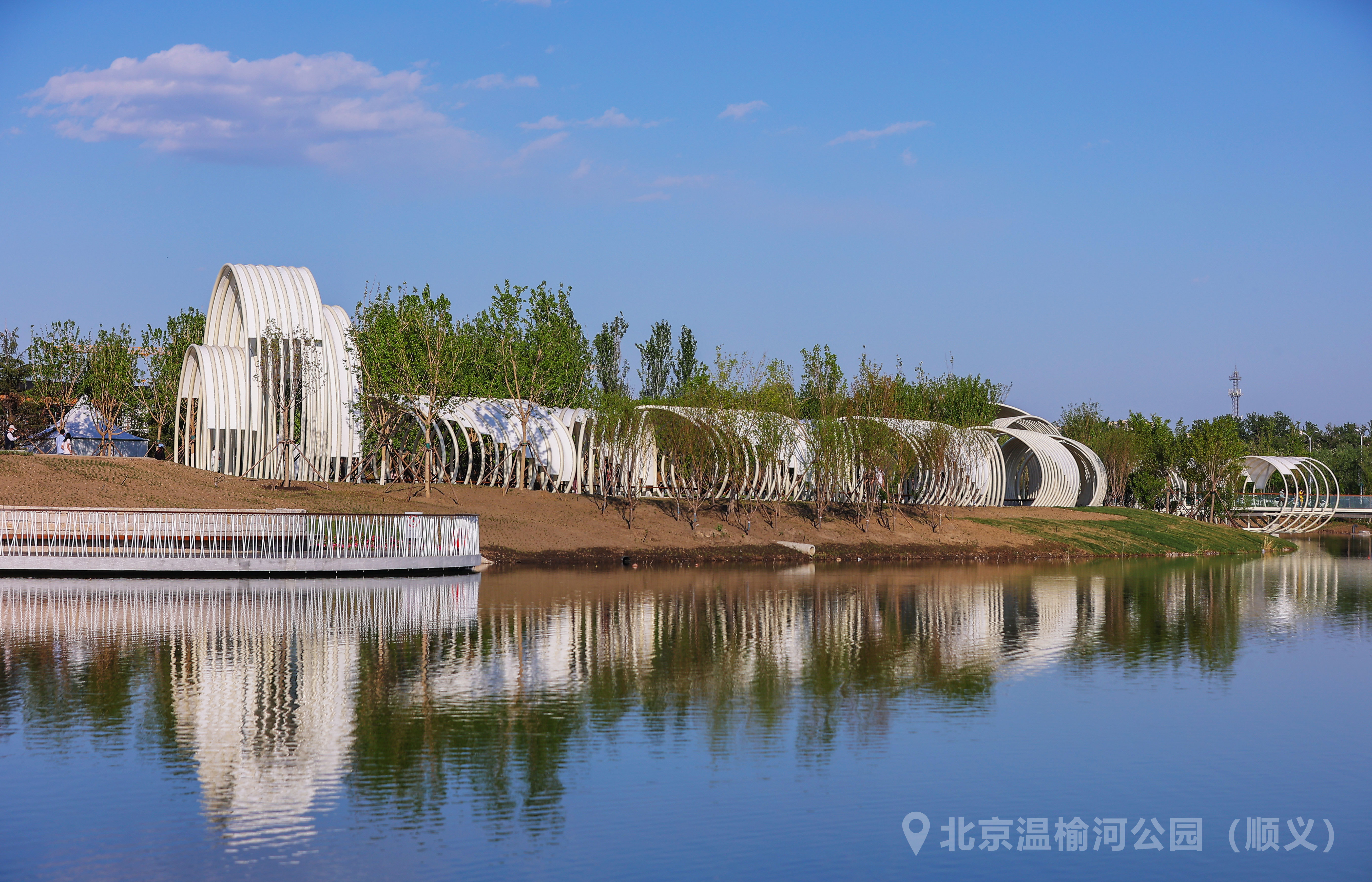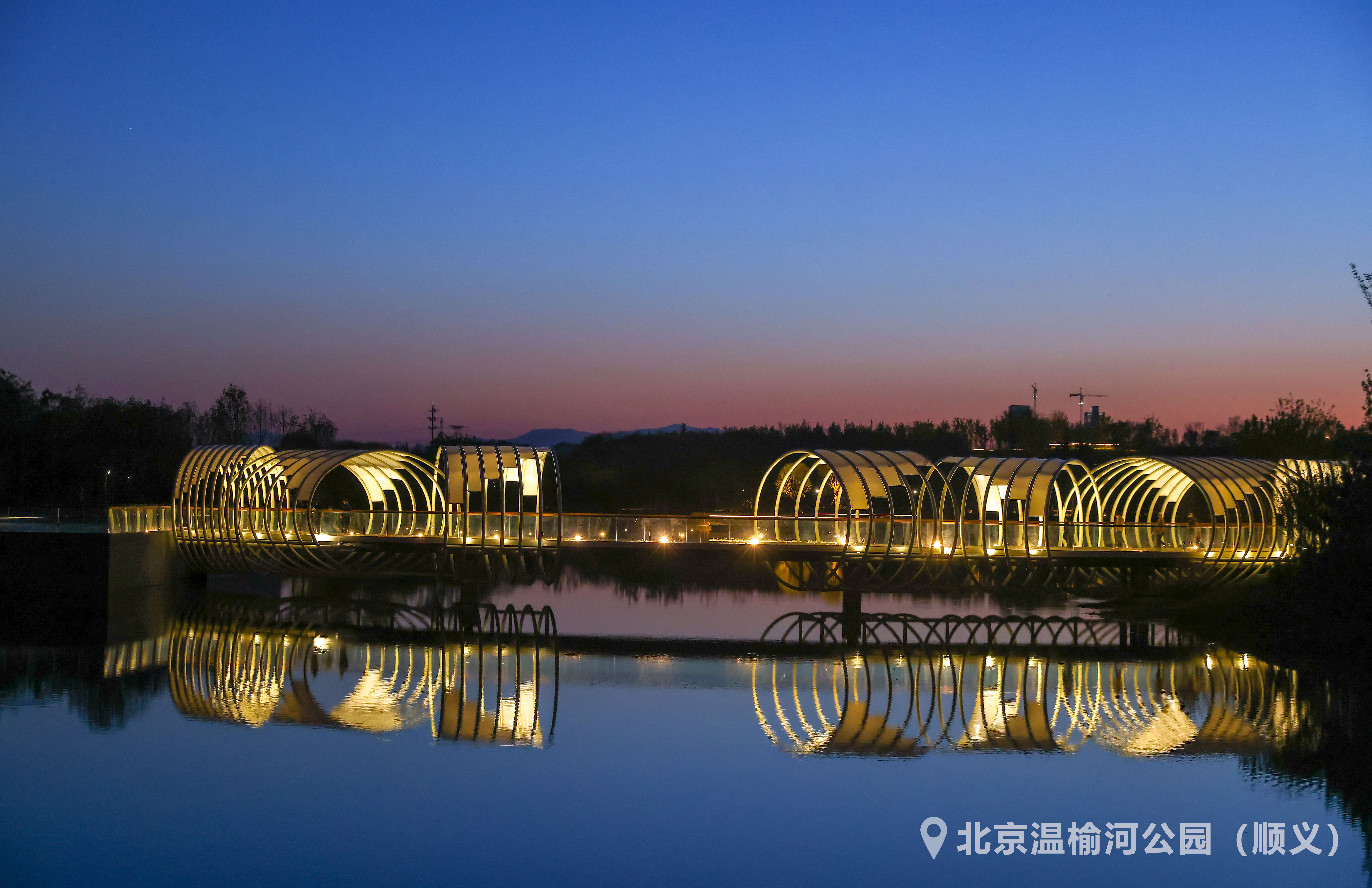 穿过花境草坪和元宝枫树林,来到“水韵长廊”,长廊之上架设了大小不一铁柱,不规则环形,犹如粼粼的水波,傍晚时分,在地灯照射下,五彩斑斓。