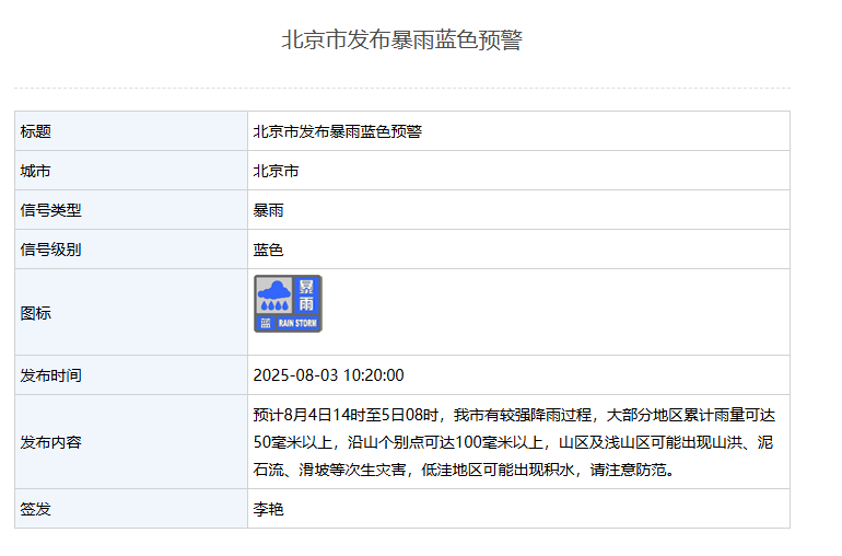 据北京市气象局消息,北京市发布暴雨蓝色预警:预计8月4日14时至5日08时,我市有较强降雨过程,大部分地区累计雨量可达50毫米以上,沿山个别点可达100毫米以上,山区及浅山区可能出现山洪、泥石流、滑坡等次生灾害,低洼地区可能出现积水,请注意防范。