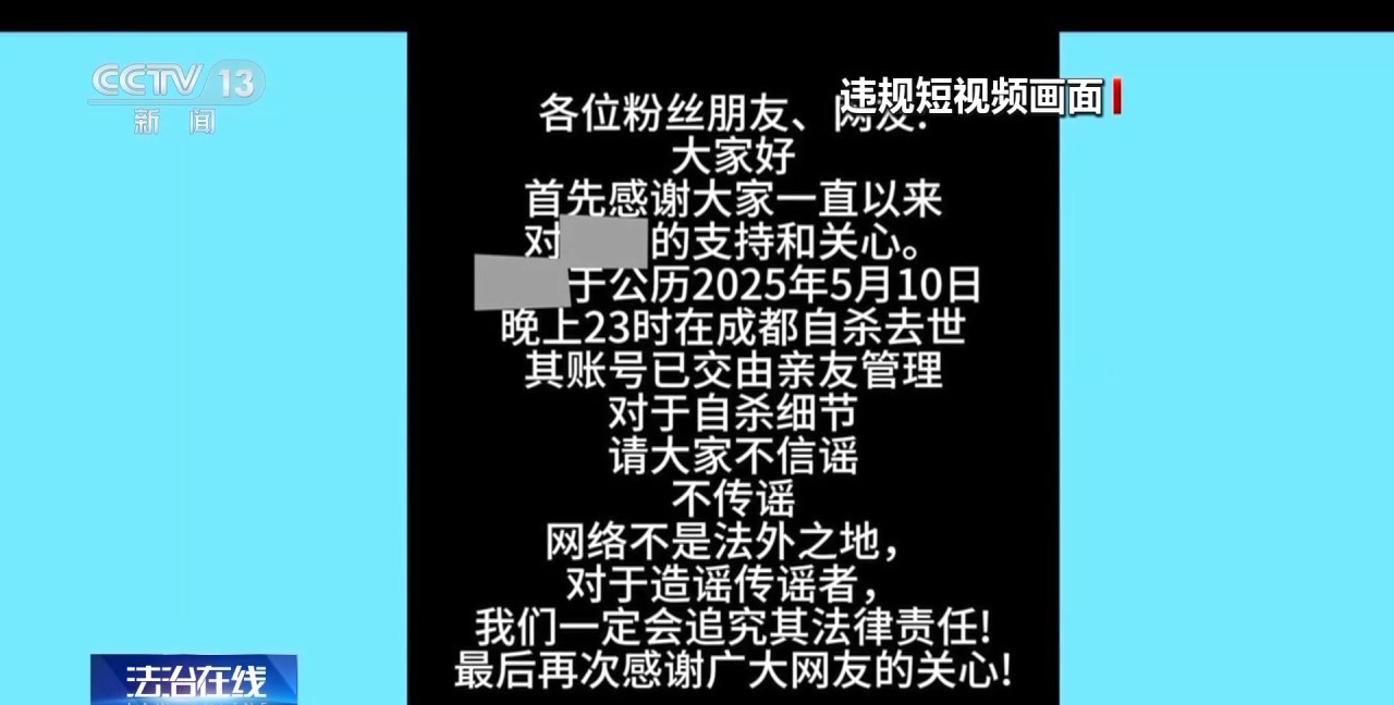 这条短视频就是其中一个典型案例。它发布于今年5月11日,账号有着将近150万粉丝。视频内容主要为这样一段文字:博主于发布视频的前一天晚上11点自杀去世,其账号已交由亲友管理。视频中还写道:网络不是法外之地,对于造谣传谣者,将追究法律责任。