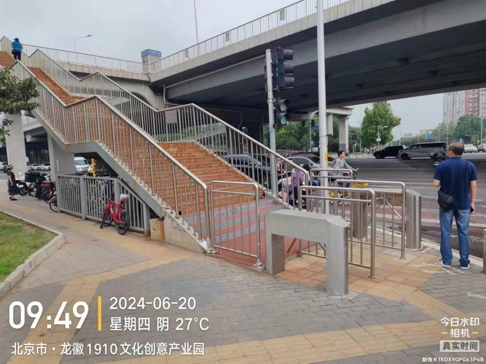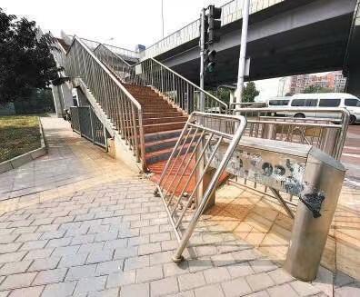 5月21日夜间,田村路街道在视频监控巡查中,发现快速公交4线阜玉路口站的天桥附近有一护栏根部出现了脱落损坏情况。