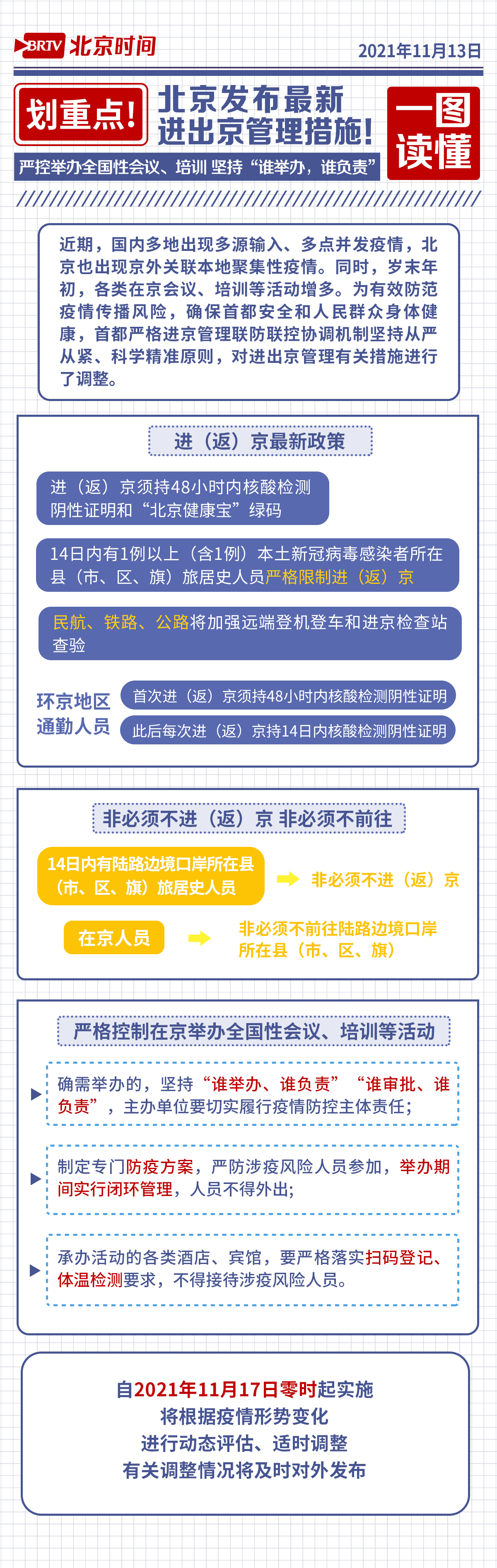 今天下午,北京市召开新型冠状病毒肺炎疫情防控工作第259场新闻发布会。北京时间记者在发布会上获悉,近期,国内多地出现多源输入、多点并发疫情,北京也出现京外关联本地聚集性疫情。同时,岁末年初,各类在京会议、培训等活动增多。为有效防范疫情传播风险,确保首都安全和人民群众身体健康,首都严格进京管理联防联控协调机制坚持从严从紧、科学精准原则,对进出京管理有关措施进行了调整,严格控制在京举办全国性会议、培训等活动,确需举办的,坚持“谁举办、谁负责”“谁审批、谁负责”。一图读懂↓↓↓