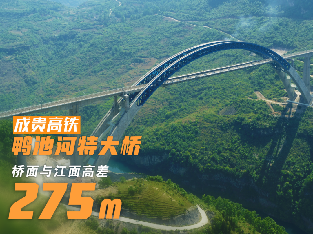 成贵高铁鸭池河特大桥,位于贵州省黔西县索风营水电站上游约8公里处,是世界最大跨径高速铁路中承式空腹钢混结合提篮拱桥。大桥全长971米,主桥跨度为436米,桥面与江面高差275米。