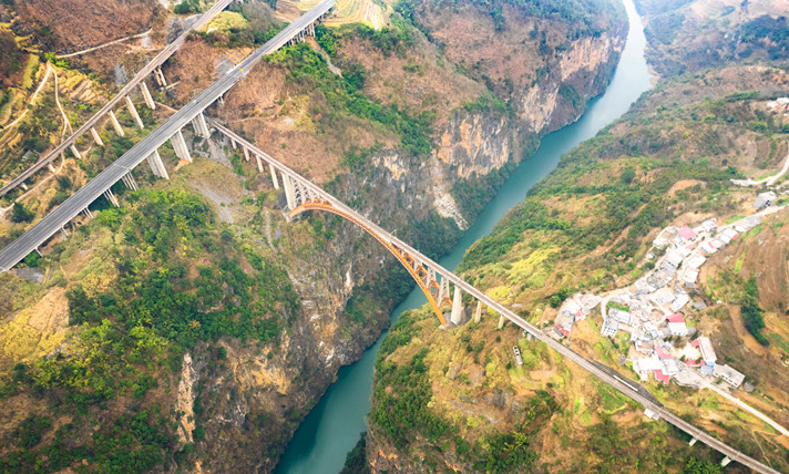 沪昆高铁北盘江特大桥,位于贵州省关岭布依族苗族自治县与晴隆县交界处,为上承式劲性骨架钢筋混凝土拱桥,大桥以一跨形式跨北盘江而过。大桥全长721米,其中主桥跨度445米,桥面距离北盘江江面约300米。