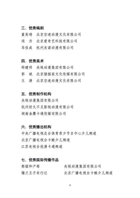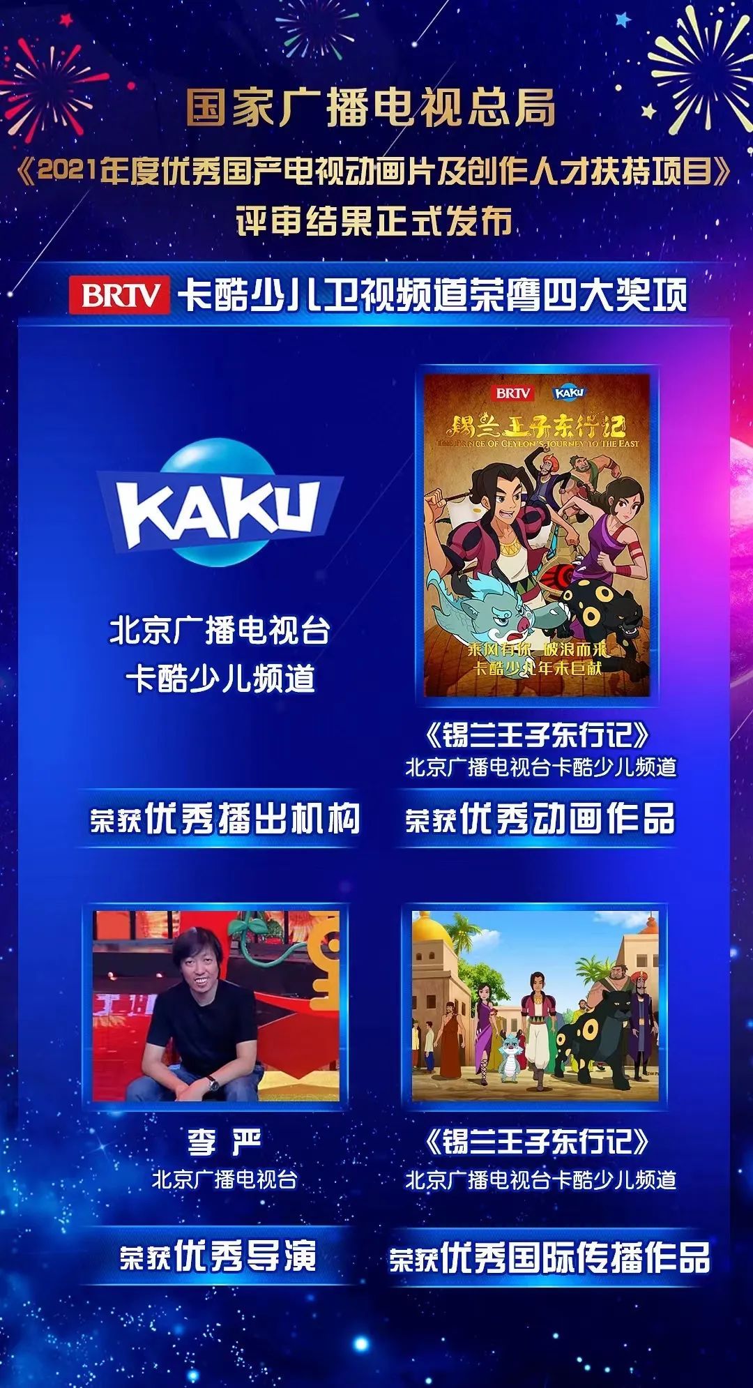 其中,卡酷原创动画《锡兰王子东行记》荣获优秀动画作品、优秀国际传播作品,动画片总导演李严荣获优秀导演,北京广播电视台卡酷少儿频道荣获优秀播出机构。