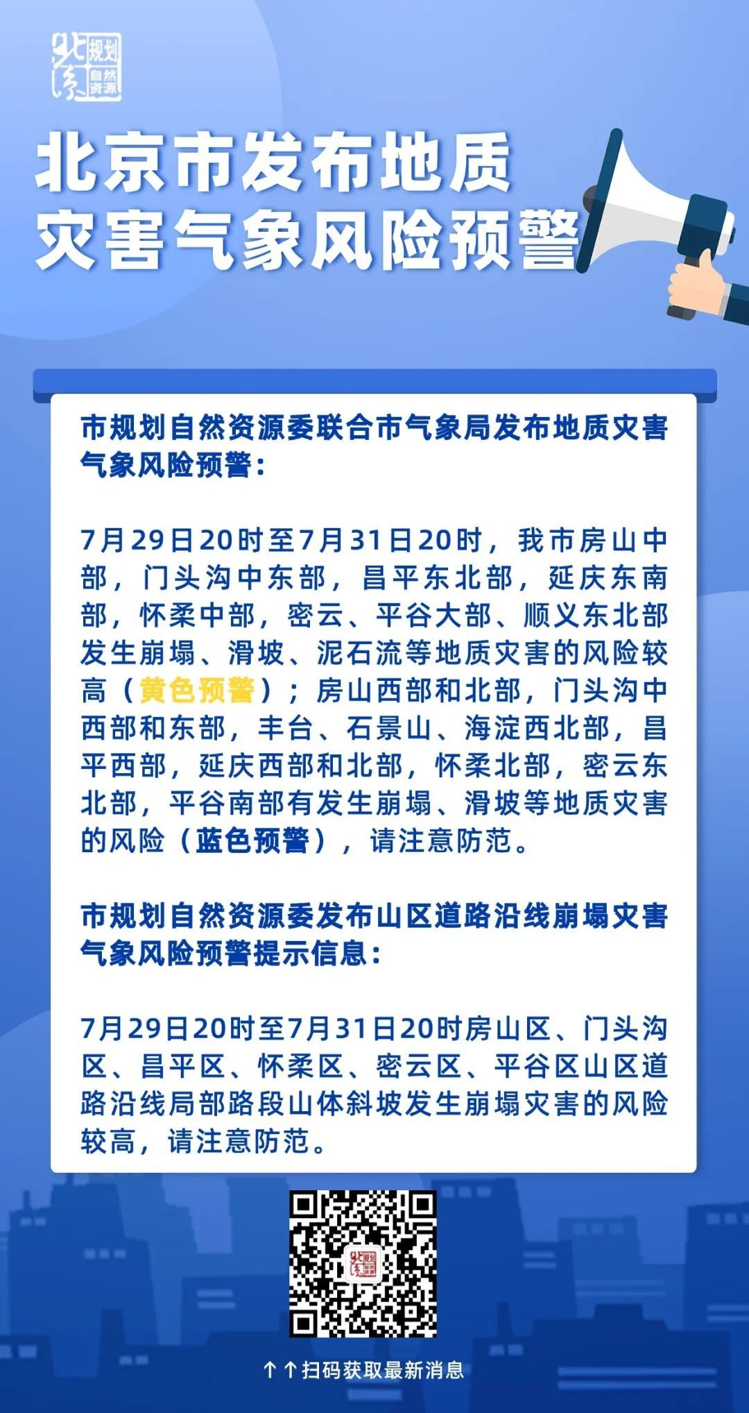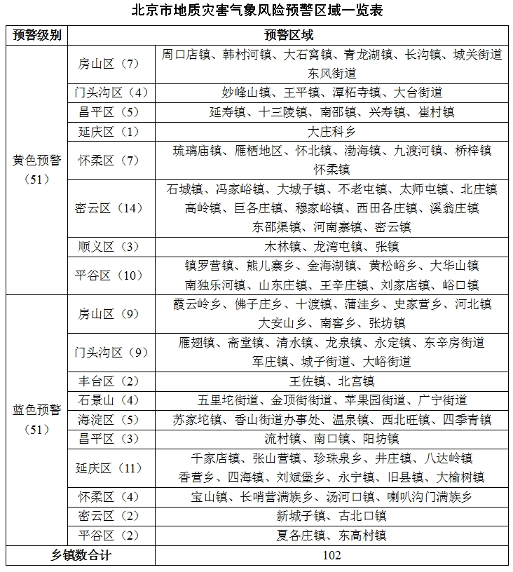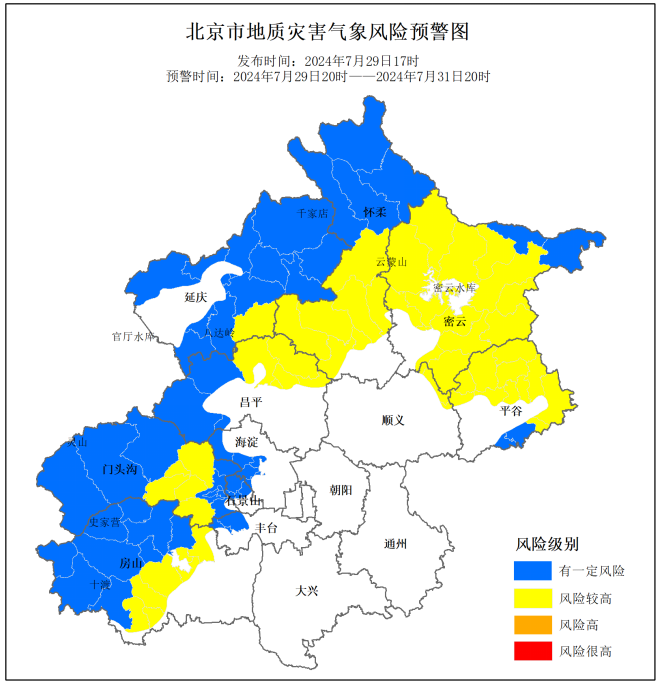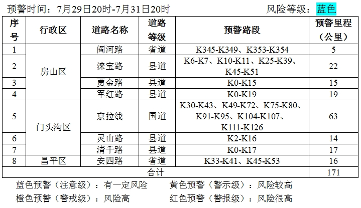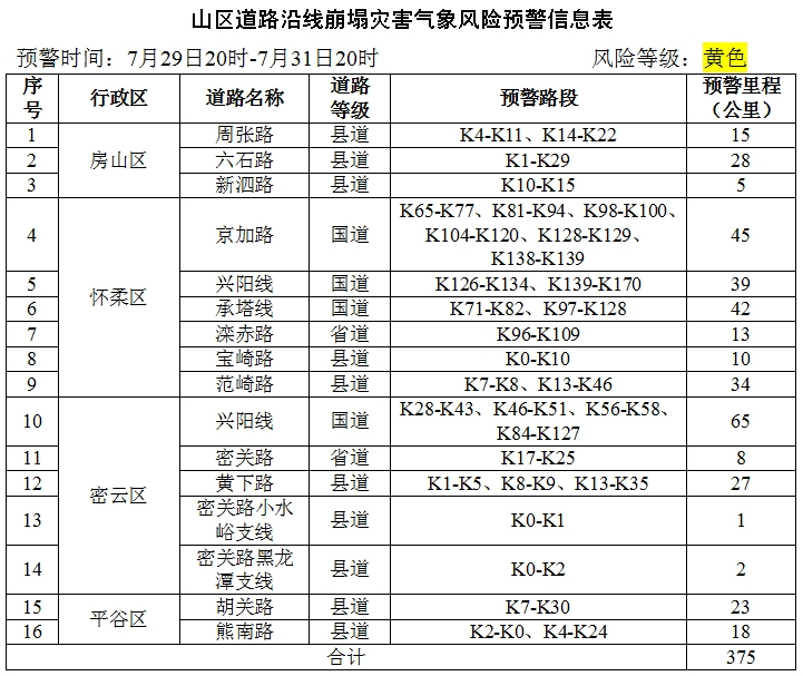 北京市规划自然资源委提示:7月29日20时至31日20时,房山区、门头沟区、昌平区、怀柔区、密云区、平谷区山区道路沿线局部路段山体斜坡发生崩塌灾害的风险较高,请注意防范。