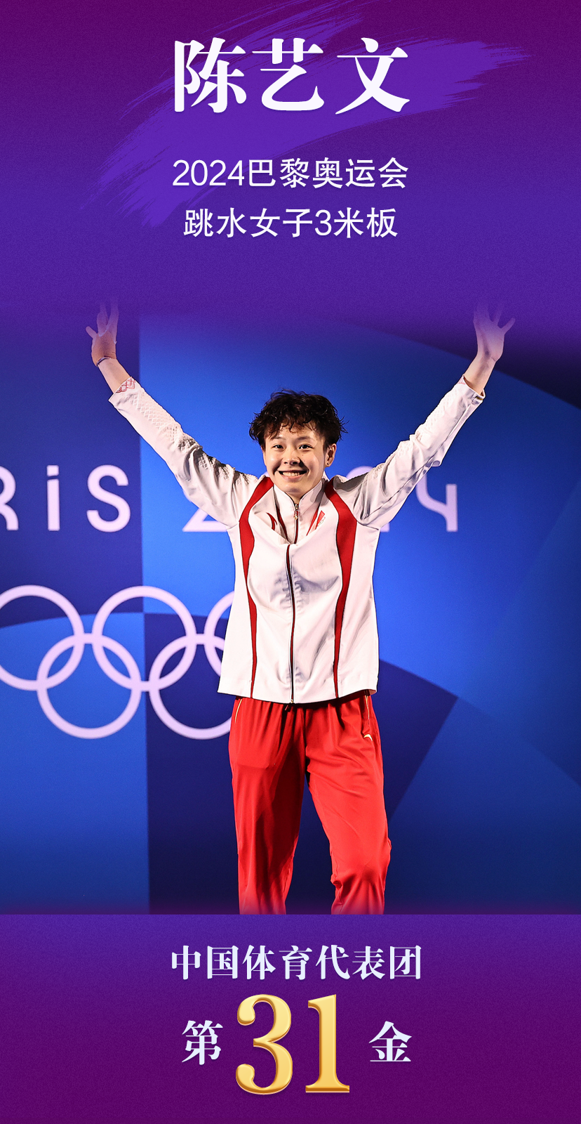 8月9日,在巴黎奥运会跳水女子3米板决赛中,中国选手陈艺文夺得金牌。