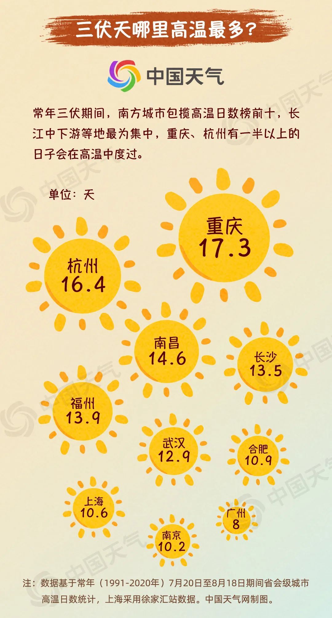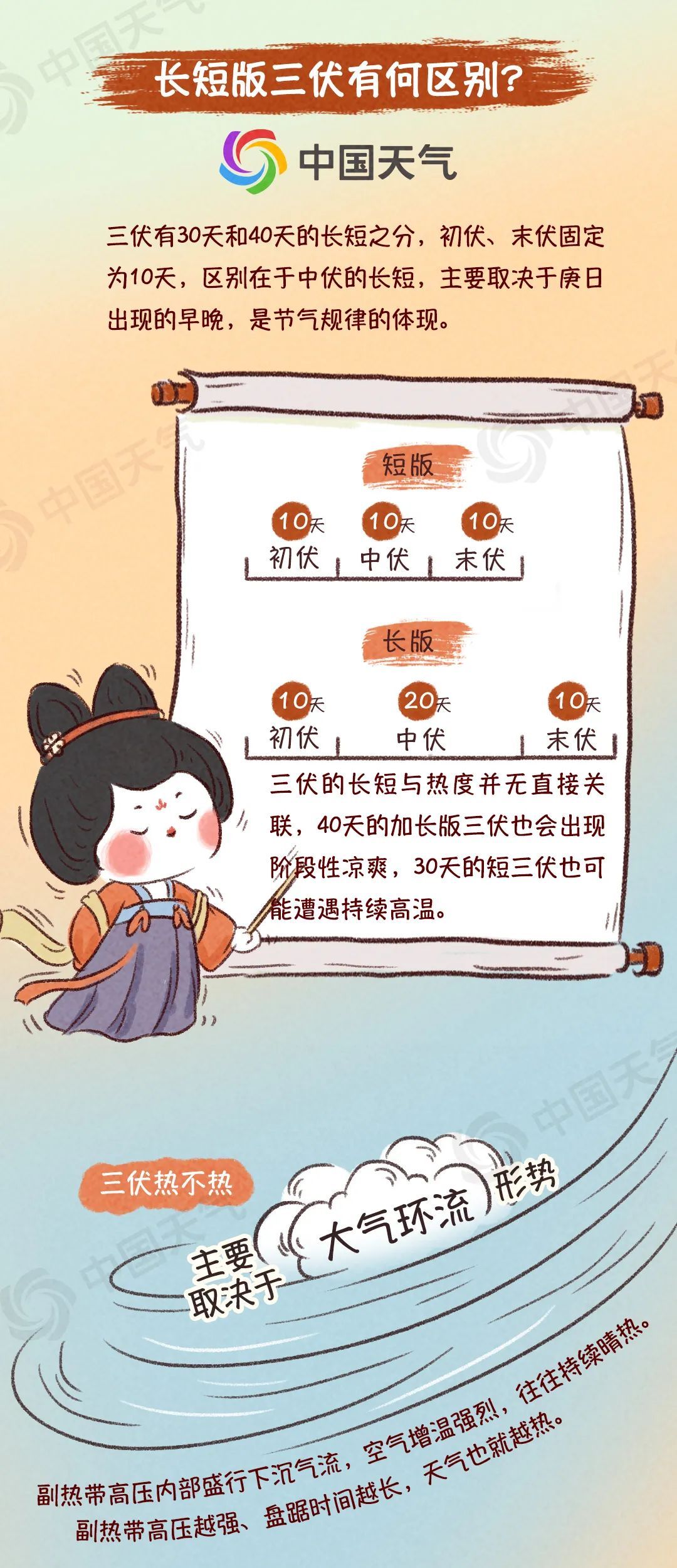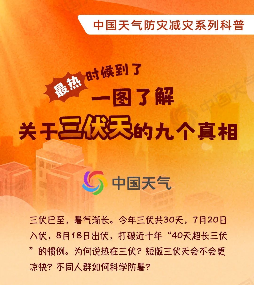 今天(7月20日),我国正式入伏,意味着一年中最热的时候来了。今年为30天短版三伏,打破了近十年“40天超长三伏”的惯例。为何说热在三伏?短版三伏天会不会更凉快?不同人群如何科学防暑?中国天气网推出防灾减灾系列科普,一图了解关于三伏天的9个真相。