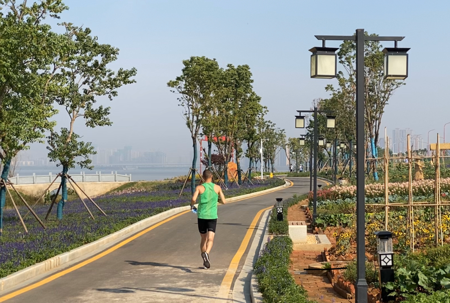 图:运动员在军运村边的黄家湖畔跑步 田雪吟摄
