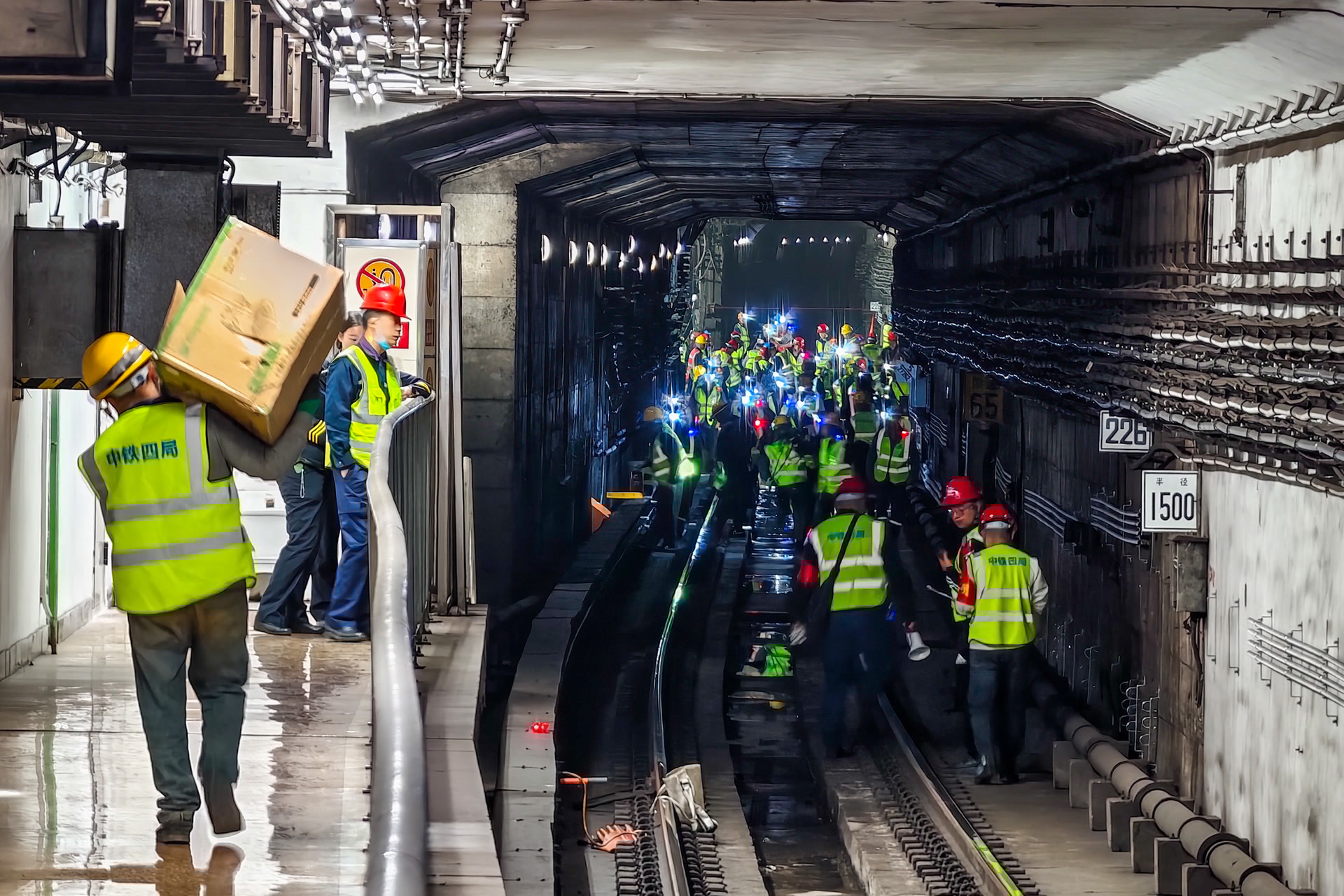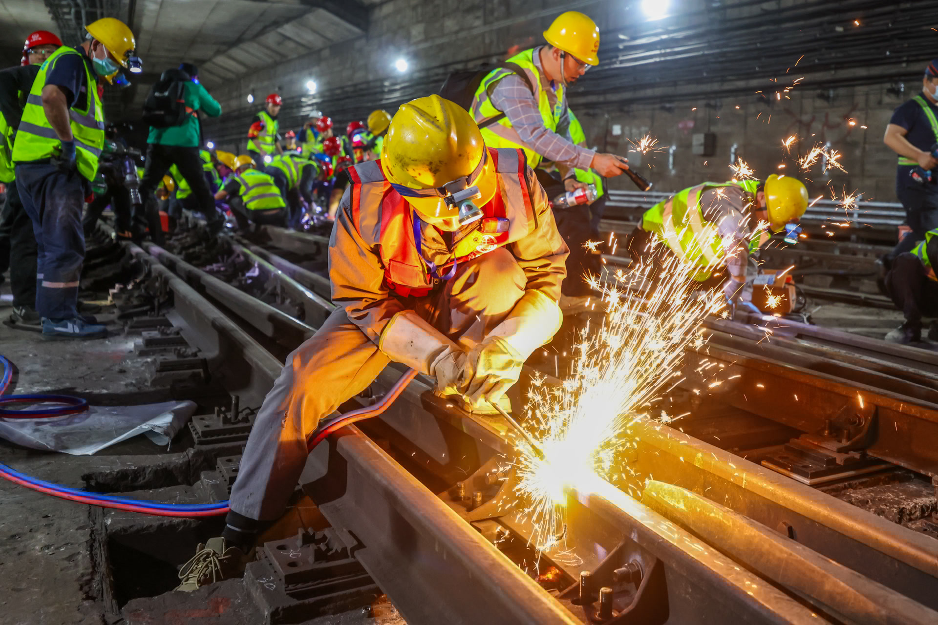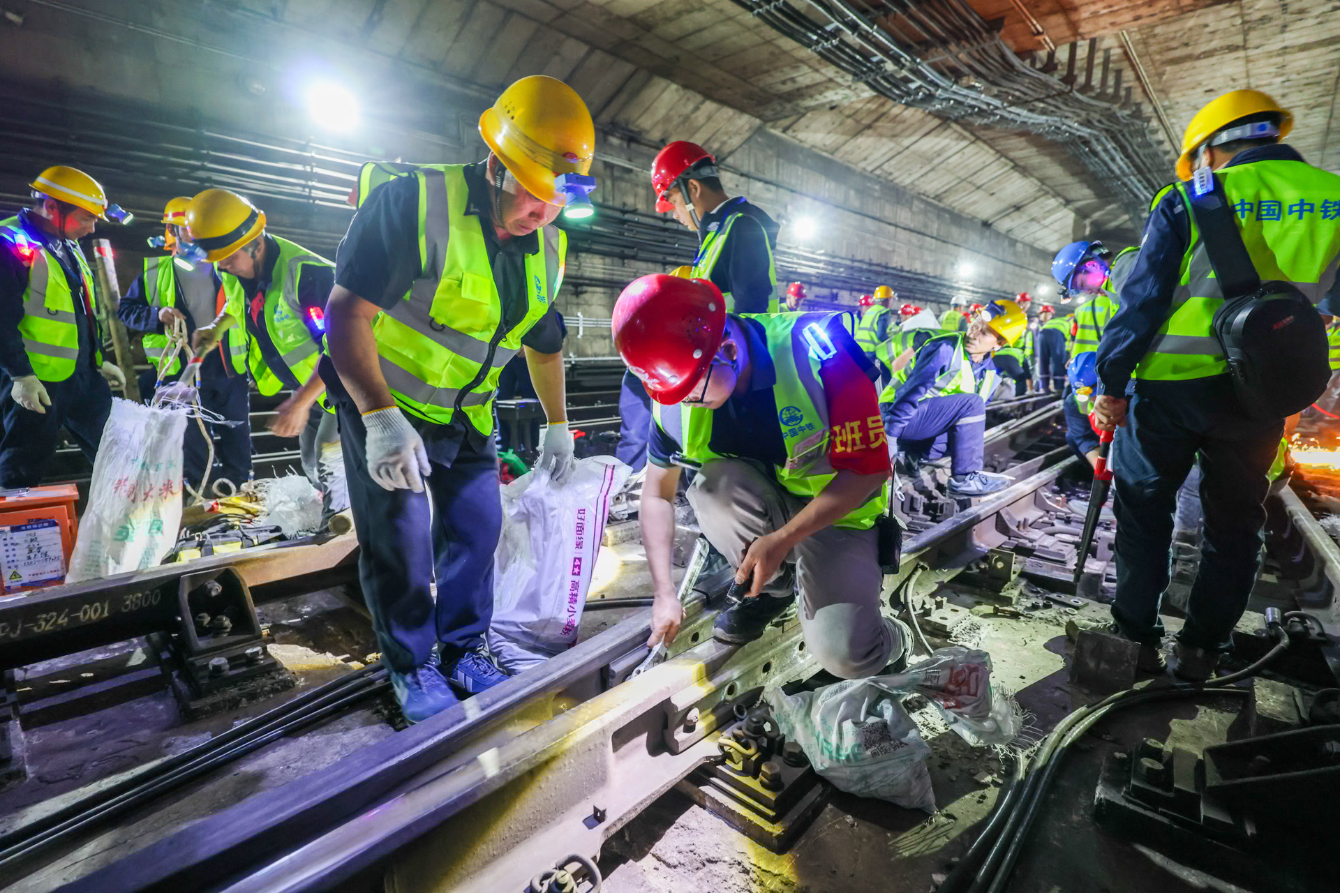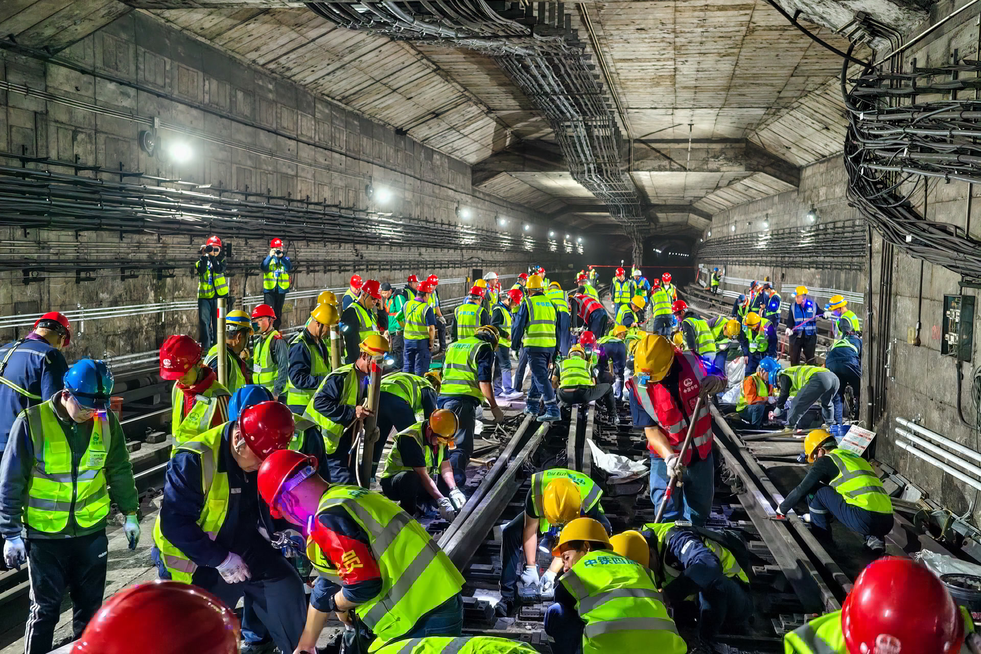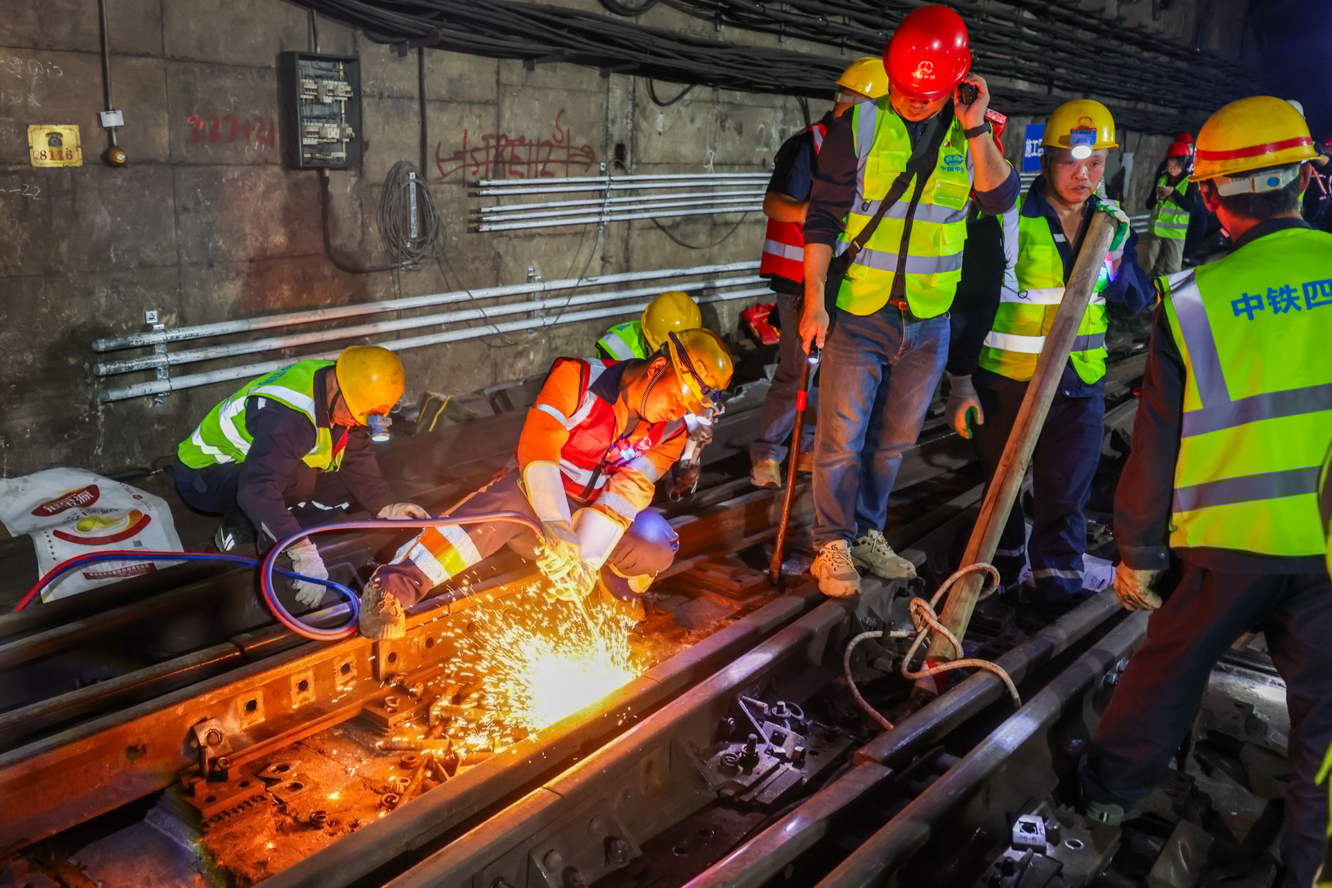 晚10点整,线路正式封闭,110余名施工人员陆续“钻”入地下。地铁隧道内十分狭窄,大型机械无法进场,施工人员只能手持电动扳手、切割工具,分别将30余根轨连线、4组转辙机、20余根道岔轨件、160套扣件成功拆除,并将旧道岔搬出。现场设备轰鸣、火花四溅,场面震撼。