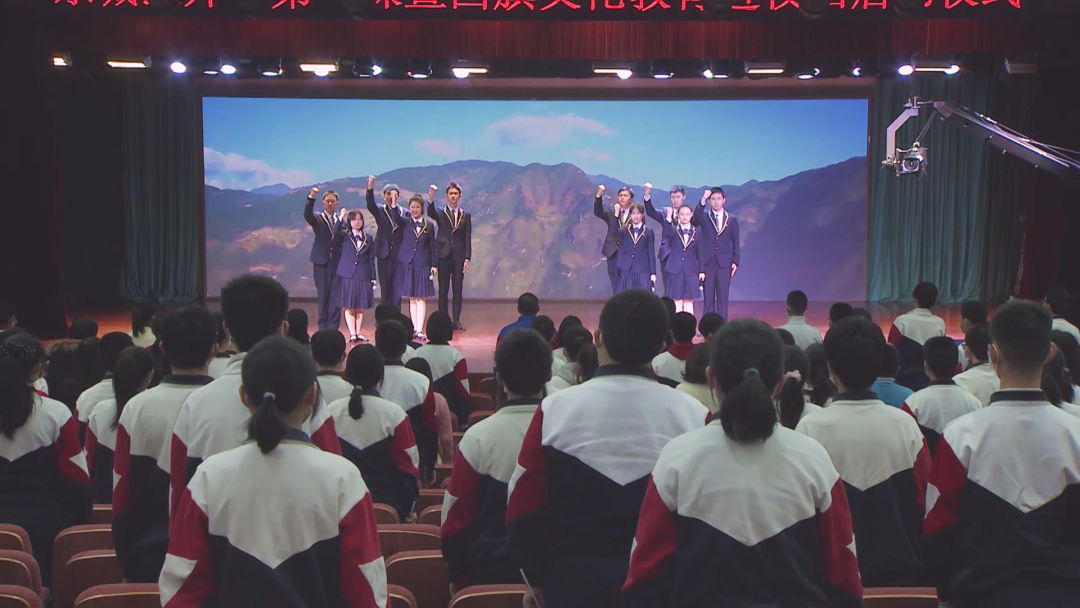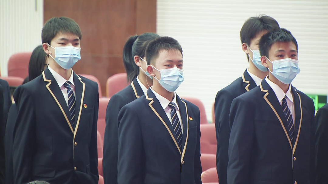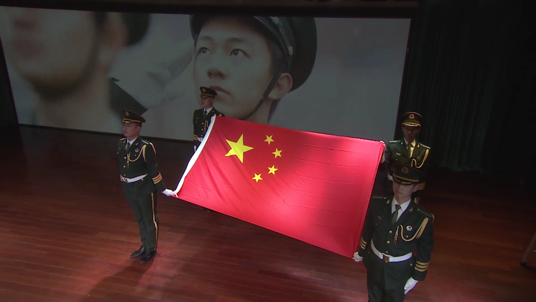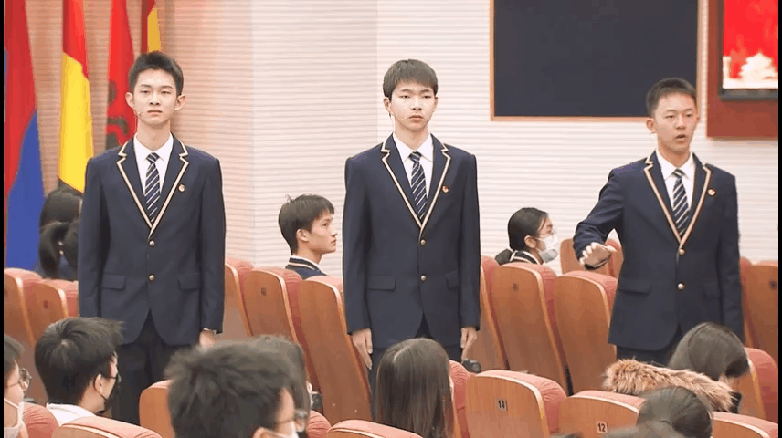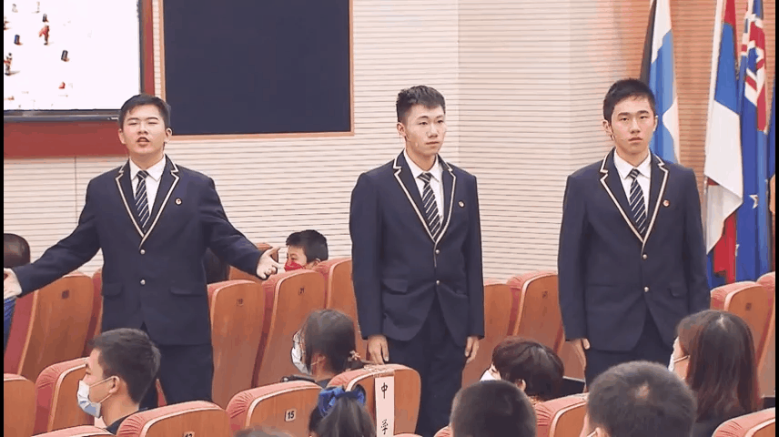 灯光渐暗,第五十五中学报告大厅屏幕上的小片展现着国旗班的英姿。