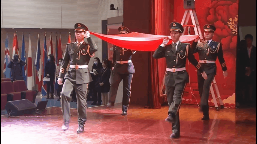 原国旗护卫队队员们喊着嘹亮的口号,踢着整齐划一的正步,高举国旗走上舞台。
