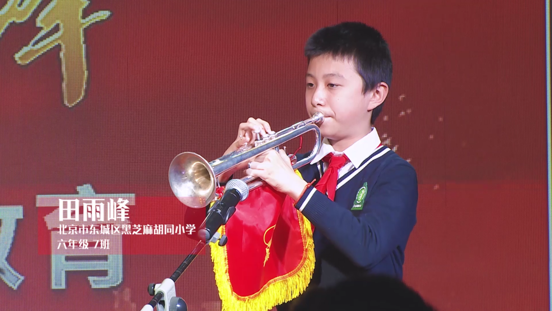 首先,进行升旗仪式,北京市东城区黑芝麻胡同小学六年级七班的小号手田雨峰,吹奏起《我和我的祖国》。