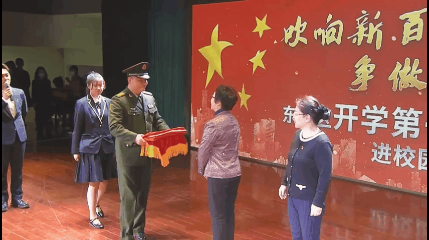 今天,在东城区开学第一课,这个特殊的时间点,三军仪仗队大队长韩捷为东城区委教育工委、 东城区教委赠旗,尤娜主任接受赠旗。旗帜传递着深厚的国旗文化和爱国情怀,传达着东城区教育人对同学们的殷切期望与祝福。北京市第五十五中学作为国旗文化进校园活动的第一站,由陈红校长上台接受尤娜主任传递的国旗。