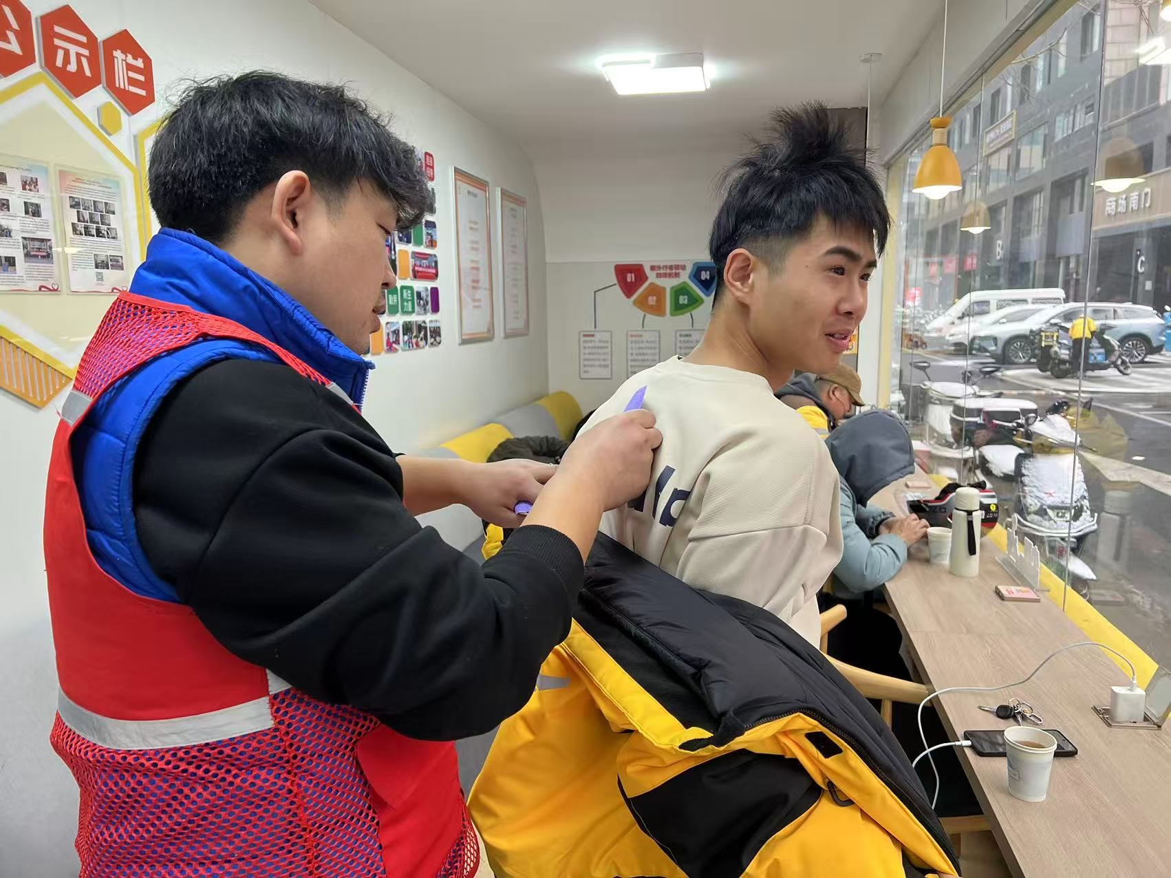 张磊帮助前来休息的外卖骑手贴上暖宝宝 朝外街道办事处供图