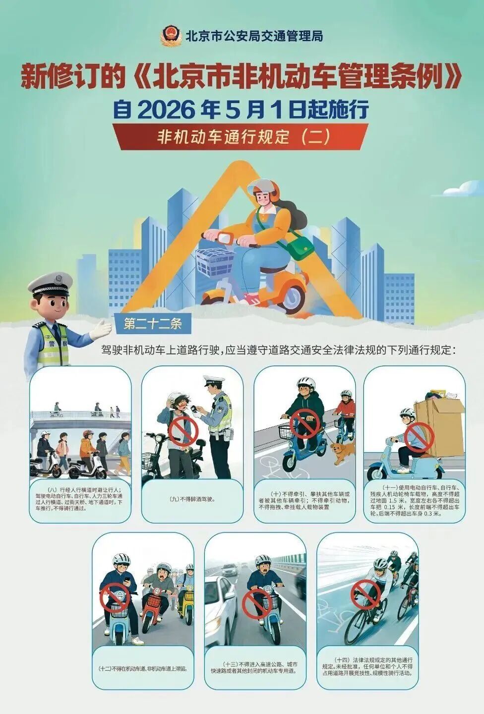 新修订的《北京市非机动车管理条例》(以下简称条例)将于今年5月1日实施,《条例》明确规定了驾乘人员要佩戴头盔、骑行时不得浏览手机、全面禁止非法拼改加装、严禁携带电动自行车电池进入居住建筑等规定。