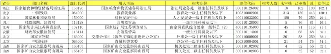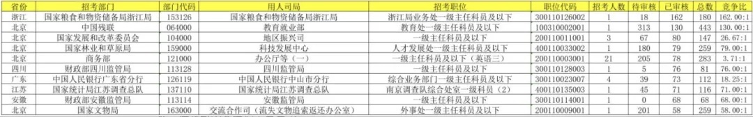 从表格呈现的国考岗位竞争数据来看,不同地区、部门的岗位竞争热度差异明显。位于浙江省的国家粮食和物资储备局浙江局的相关岗位竞争比高达162:1,位居第一;位于北京的中国残联教育就业部竞争比紧随其后,竞争比达130:1。而四川、江苏、安徽等地部分岗位竞争比相对稍缓,但也都超过了50:1。