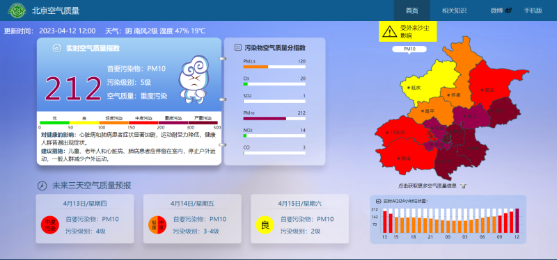 据北京市生态环境监测中心官网消息,截至4月12日12时,北京市空气质量指数为212,污染级别为5级,已达重度污染标准。目前空气中的首要污染物为PM10。