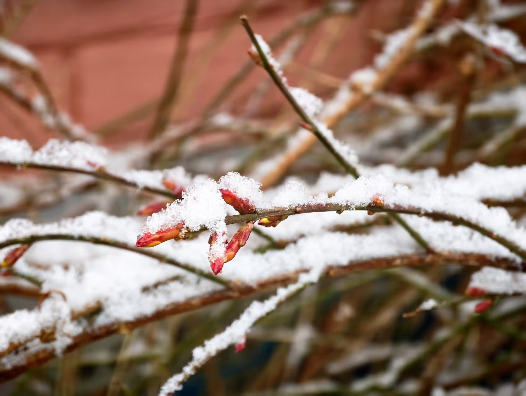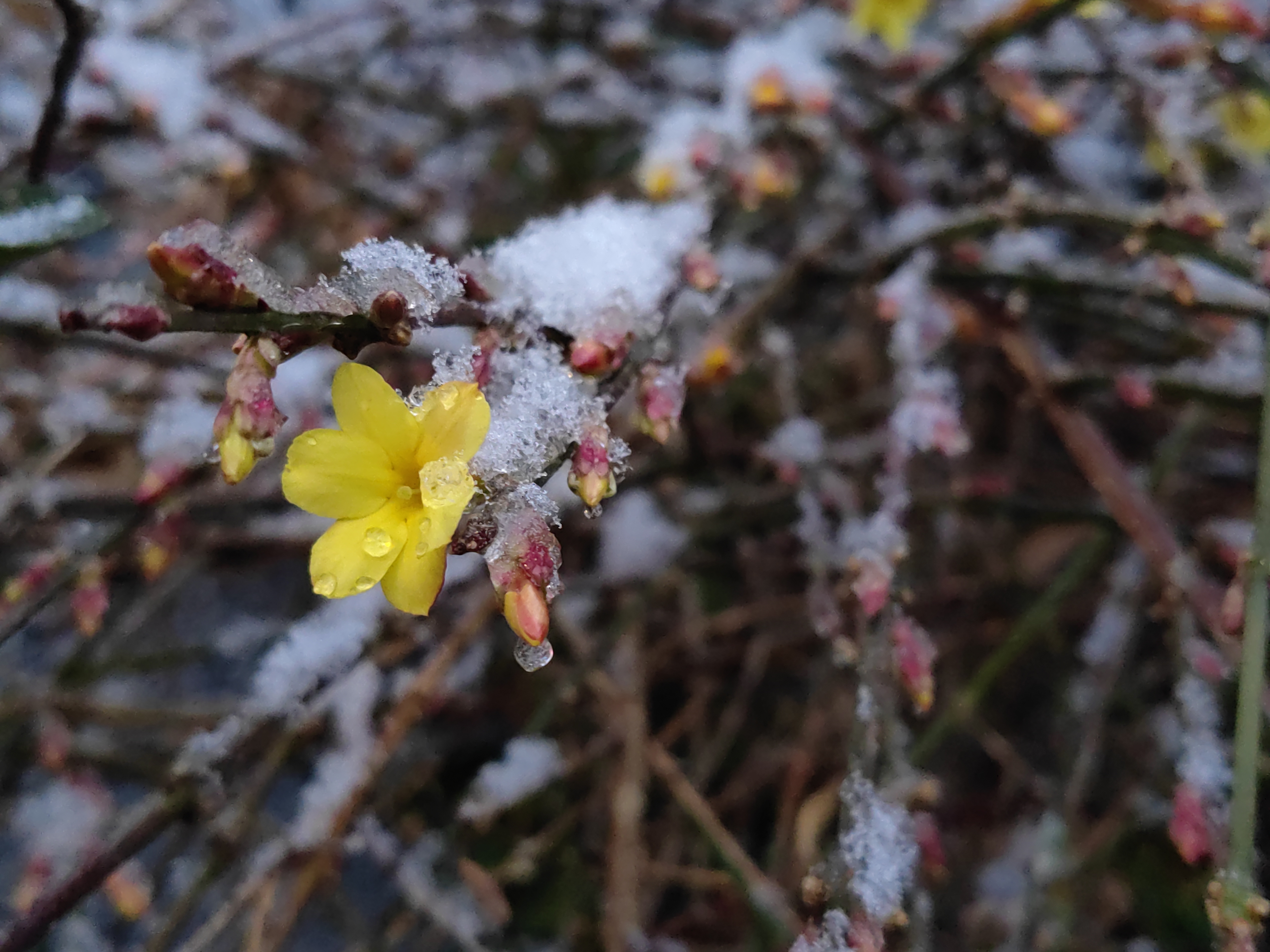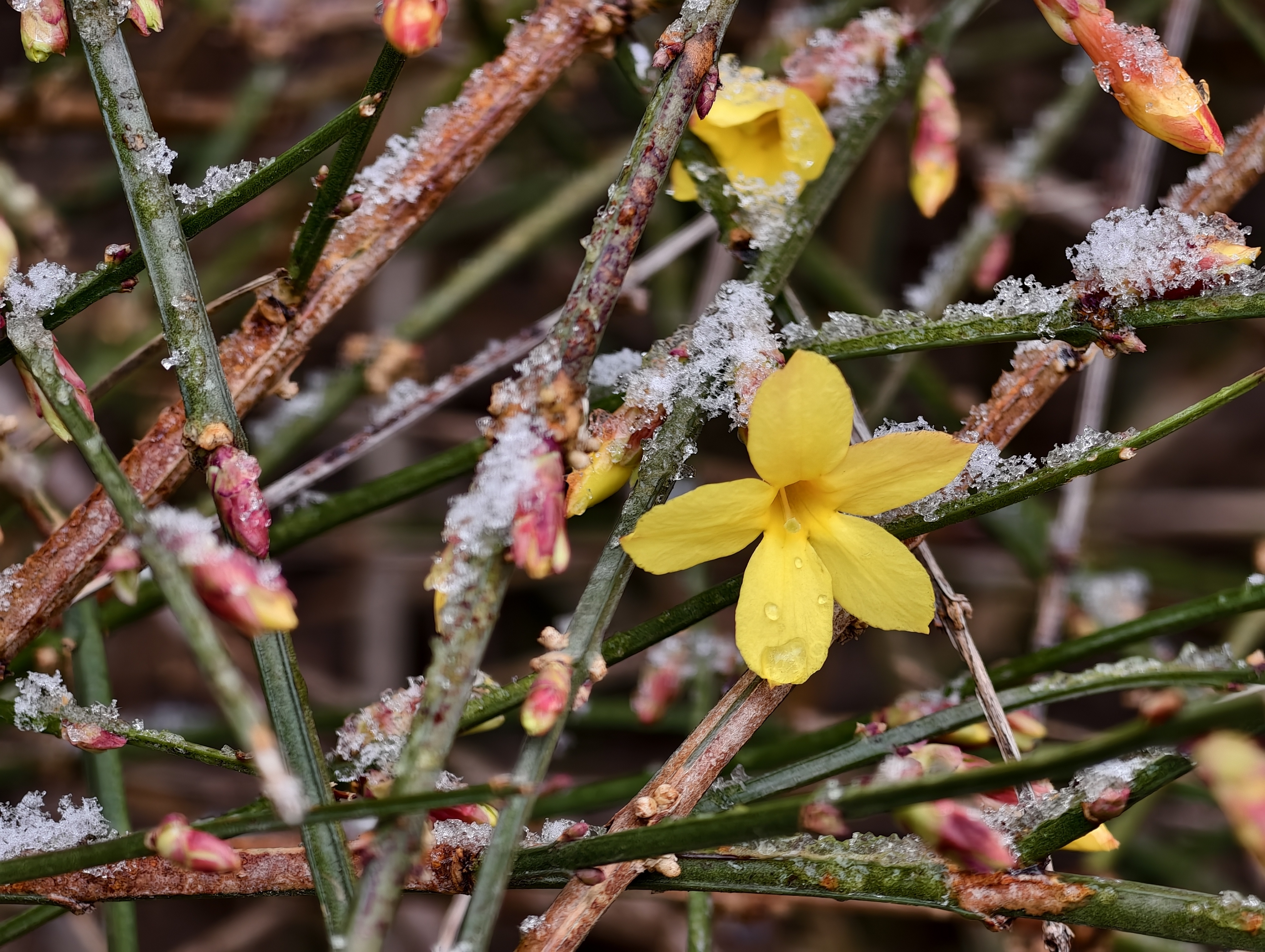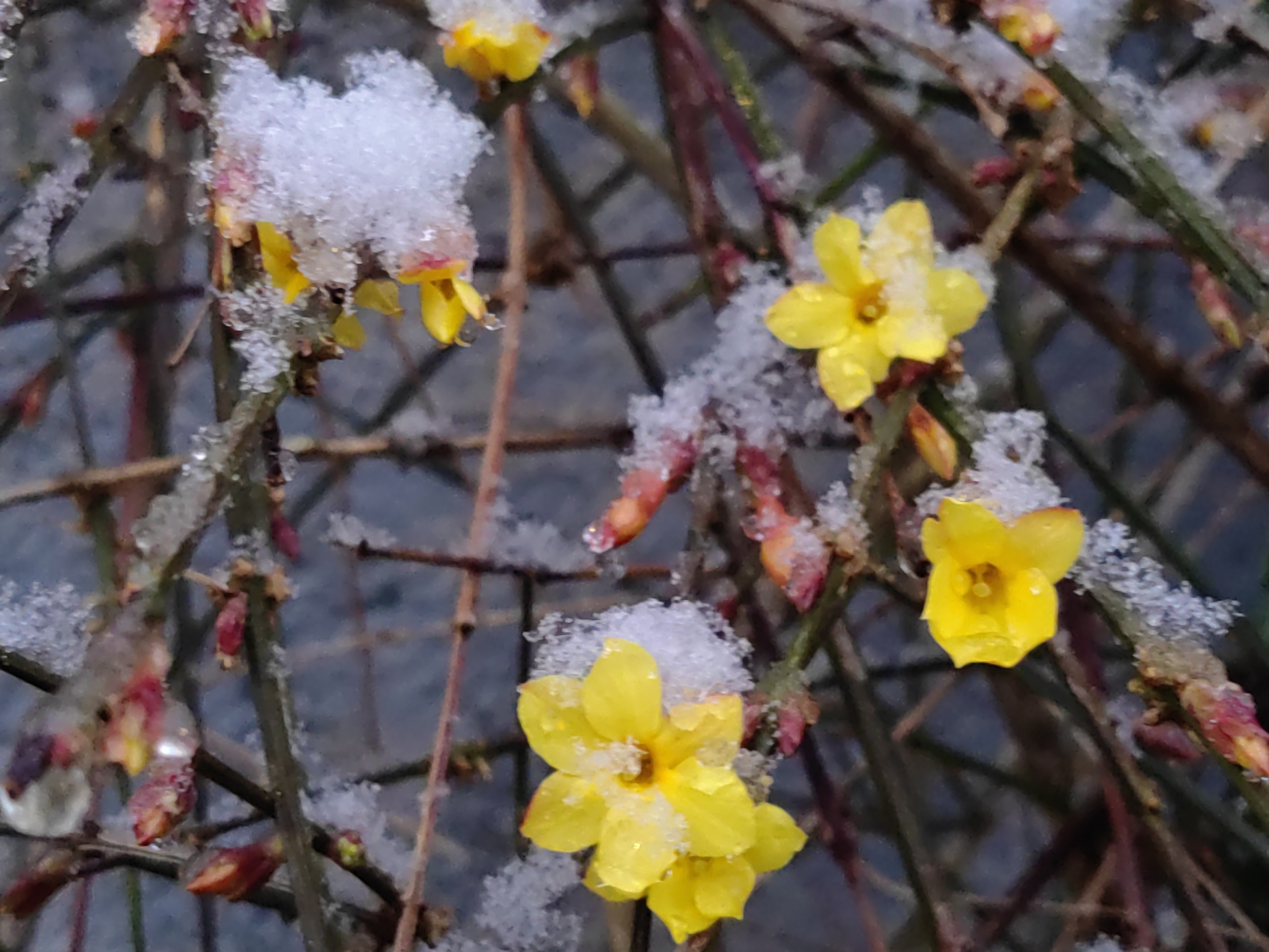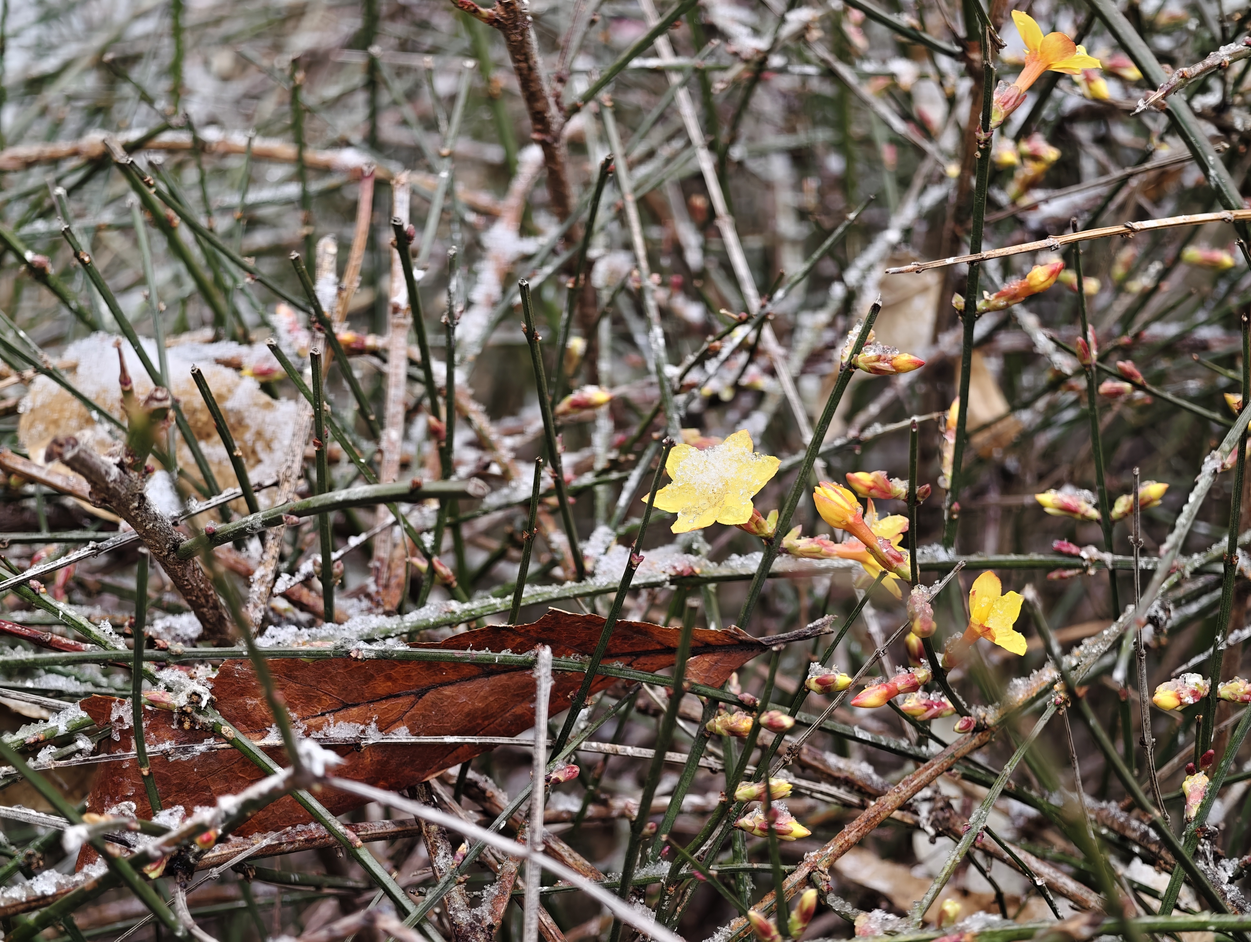 在石景山区雕塑公园,零星绽放的迎春花在寒风中傲然开放。迎春花枝头的积雪还没有完全融化,花朵已经美丽绽放,白色的积雪与黄色的花瓣交相辉映。伴随着阵阵微风,它们洁白而又素雅,展现出了浓浓春意,格外靓丽!
