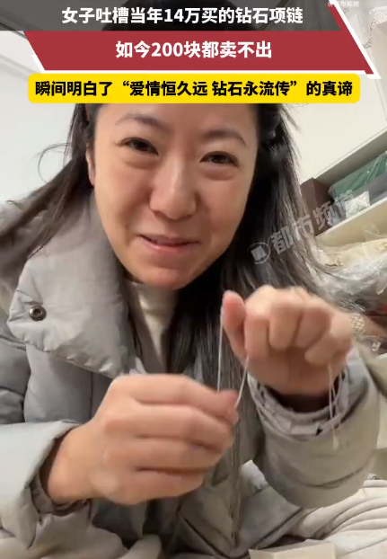 最近,很多女士面对自己的首饰,心情会有冰火两重天的感觉:看着自己的金饰品不断升值,充满喜悦;转头再看看自己的钻戒,心中哇凉。近期网络上热度最高的钻石故事是:一位女士吐槽当年14万元买的钻石项链,现在200元都没人要。同时感慨,当时要是用这个钱买黄金饰品,现在肯定大赚一笔。几乎同时,一位辽宁女子吐槽:6年前花3.6万元在香港定制的婚戒,如今回收价仅4、5百元,商家直言“主要看中戒托的铂金材质”。